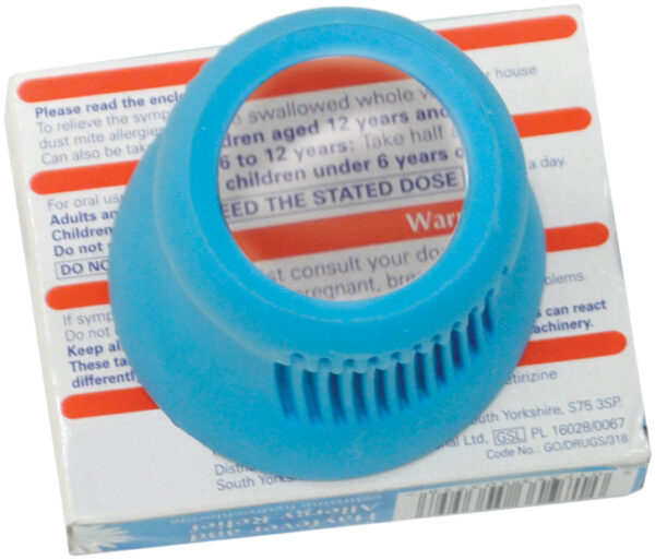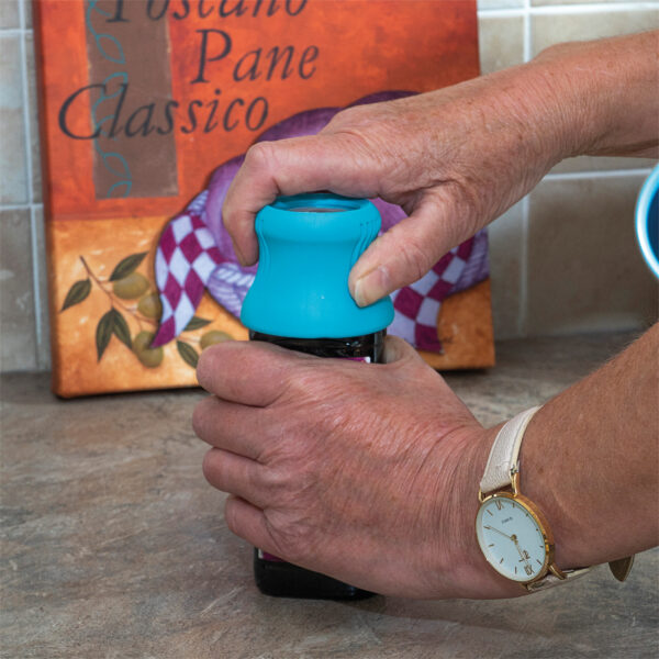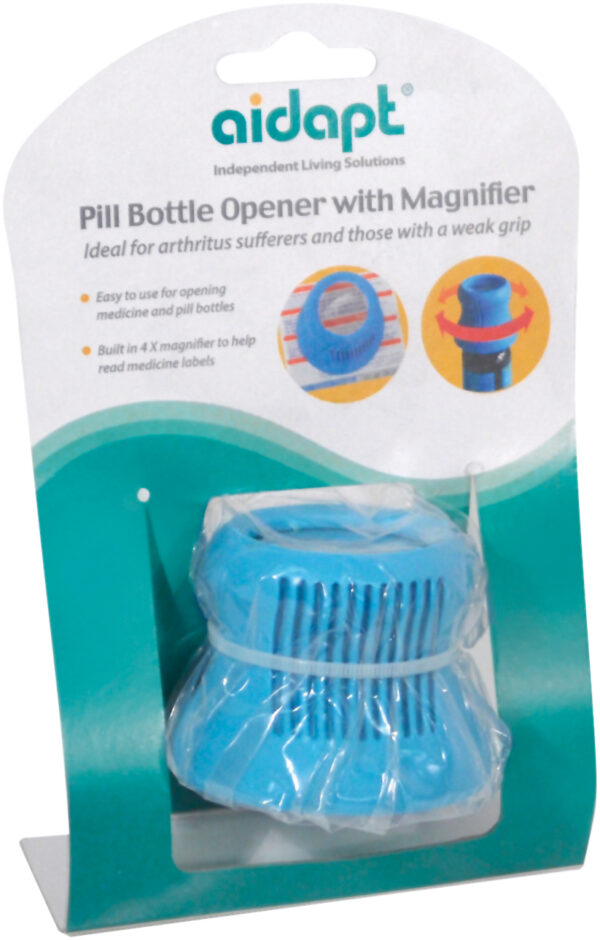 This handy pill/medicine bottle opener is ideal for users with a weak grip or arthritis. The opener is ribbed both on the inside and the outside for superior grip and includes a 4X magnifier on the top for reading the fine print on labels. The opener is small enough to fit into a purse or a bag so that it can be used when away from home.