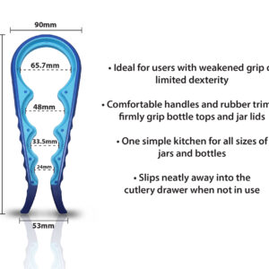 This easy-to-use kitchen aid has been cleverly designed to enable you to quickly open stubborn lids on a huge variety of jars and bottles with just one compact product. It is ideal for users with a weakened grip or limited dexterity. The flexible Universal Jar and Bottle Opener features a shaped rubber trim along the inside edges for a strong grip on the lid, and a comfortable grooved outer edge for you to hold, squeeze and twist more easily. With four differently sized circular sections to cope with the smallest to the largest lids!