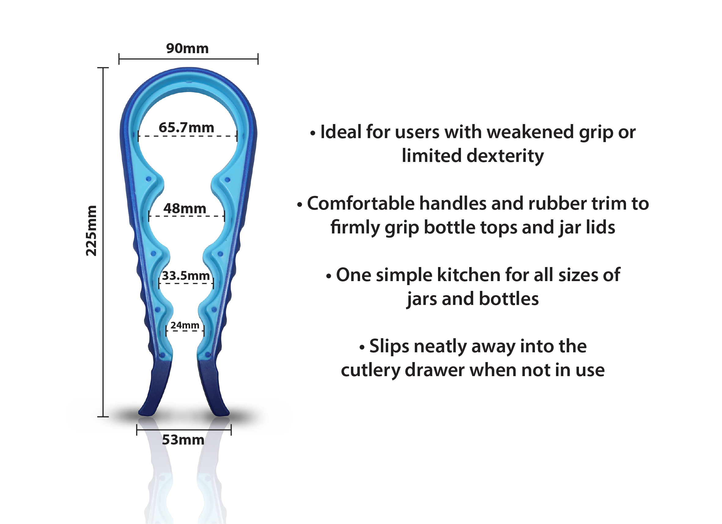 This easy-to-use kitchen aid has been cleverly designed to enable you to quickly open stubborn lids on a huge variety of jars and bottles with just one compact product. It is ideal for users with a weakened grip or limited dexterity. The flexible Universal Jar and Bottle Opener features a shaped rubber trim along the inside edges for a strong grip on the lid, and a comfortable grooved outer edge for you to hold, squeeze and twist more easily. With four differently sized circular sections to cope with the smallest to the largest lids!