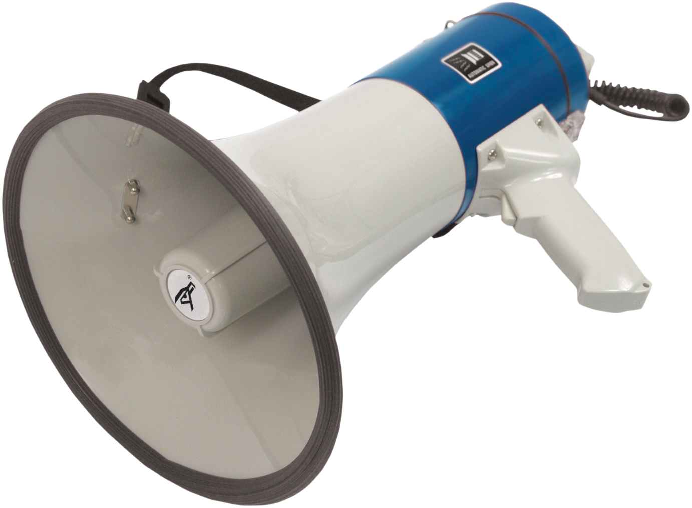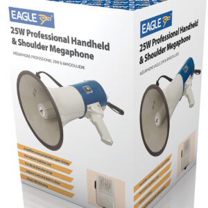 ntroducing the Eagle 25W Megaphone, featuring a robust fist microphone with a latching push-to-talk button, allowing for seamless communication. This versatile device includes a record function button, enabling users to record messages up to 30 seconds long and replay them with the press of a button. A red LED light indicates when recording is in progress. The fist microphone, attached via a durable curly cable, includes a volume control and on/off switch, and can be used independently or mounted on the unit, which has a pistol grip and a selector switch for siren or talk modes, plus a trigger button. The megaphone, which is powered by 8 C batteries (not supplied), offers clear audibility over long distances and can be shoulder-mounted using the provided strap for hands-free operation, making it ideal for a variety of outdoor and indoor uses.