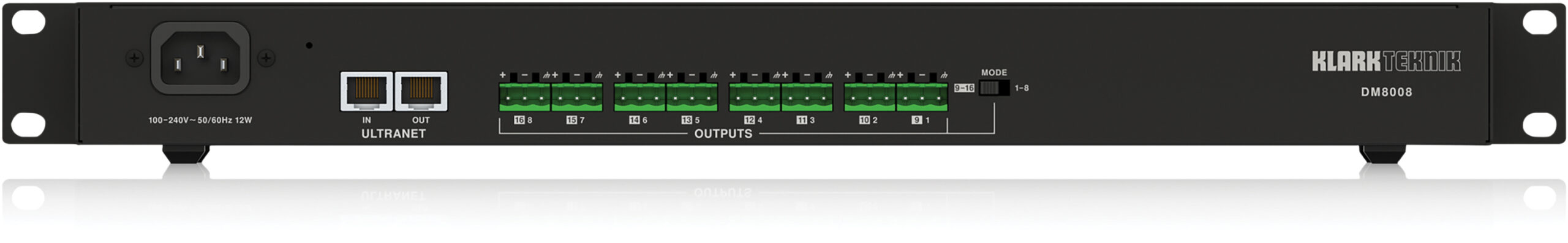 Digital music and sound distribution requires specialised tools to ensure the desired content arrives at the proper zone(s) in all its pristine sound quality. The DM8008 Channel Output Box, a rugged 19″ 1U rack-mount chassis designed specifically for the ULTRANET environment, provides 8 channels of analogue output making it ideal for use in hotels, houses of worship, casinos and a myriad of other professional audio applications. Up to 7 DM8008 s may be connected in series on a single ULTRANET cable for the ultimate in signal routing versatility. DM8008 utilises our proprietary ULTRANET networking, which allows users to transmit up to 16 independent channels of 24-bit audio via ULTRANET-enabled devices over CAT5 cabling with RJ45 connections. The digital signal is converted internally to analogue by the DM8008 s high quality 24-bit D/A converters, which offer a 48 kHz sample rate. Outputs are provided in the form of standard balanced analogue Euro block connectors. A convenient switch on the rear panel allows users to select between channels 1 – 8, or channels 9 – 16.Designed for shelf mounting or installation in conventional 19″ rack systems, DM8008 s chassis houses an auto-ranging universal switch-mode power supply (100 – 240V).