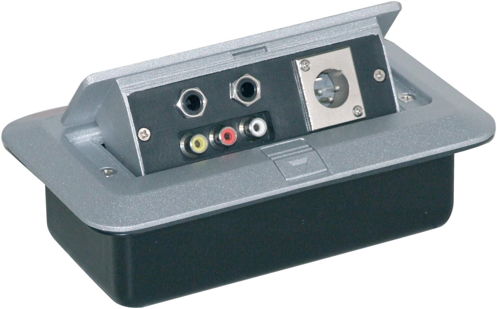 Pop up AV plate with 2 x 6.35 mm jack sockets, 3 x phono sockets and 1 x chassis male 3 pin XLR socket. Made from robust materials this product can be used on professional installations for either wall or floor mounting and comes with a fitted metal back box with knock-outs to accept cable.
