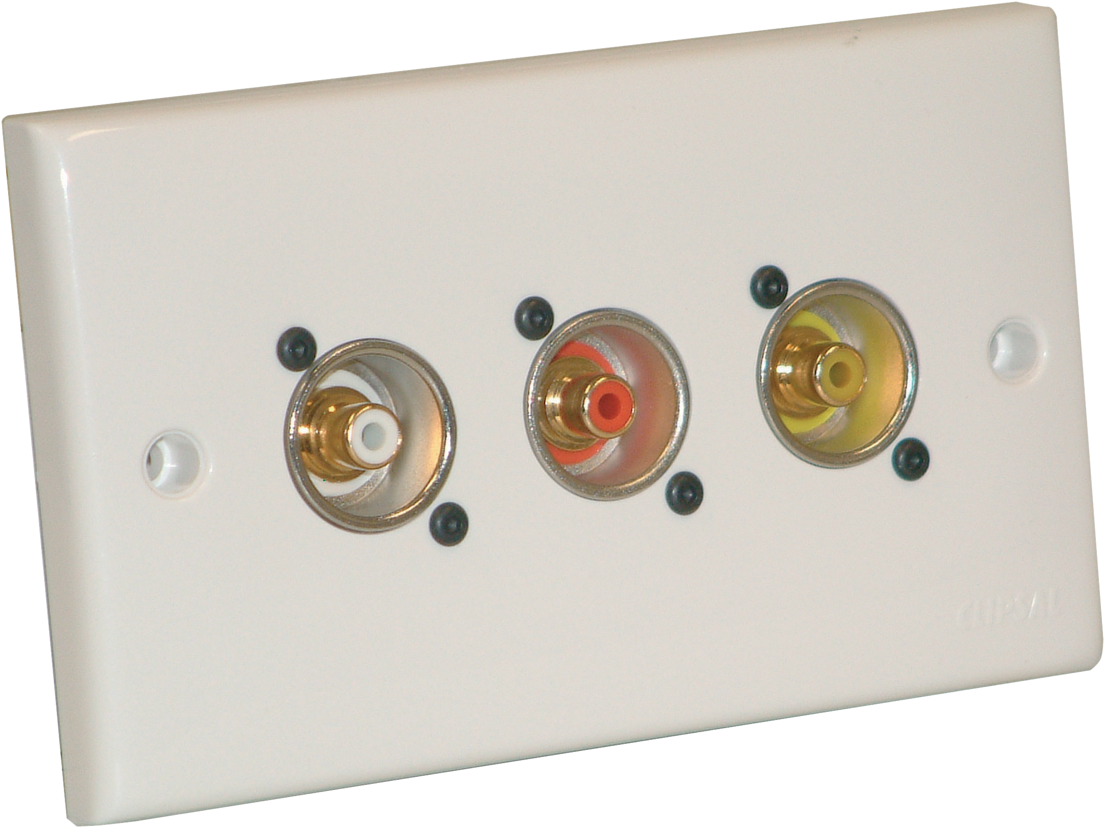Twin wall plate for either flush or surface mounting (back box not included). Comes fitted with 3x Neutrik phono sockets.
