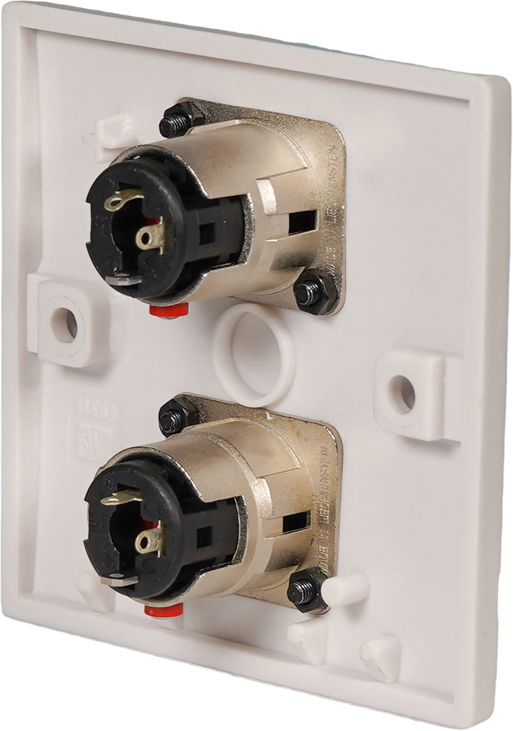 Single wall plate for either flush or surface mounting (back box not supplied). Comes fitted with 2x Neutrik locking jack sockets (NJ3FP6C).