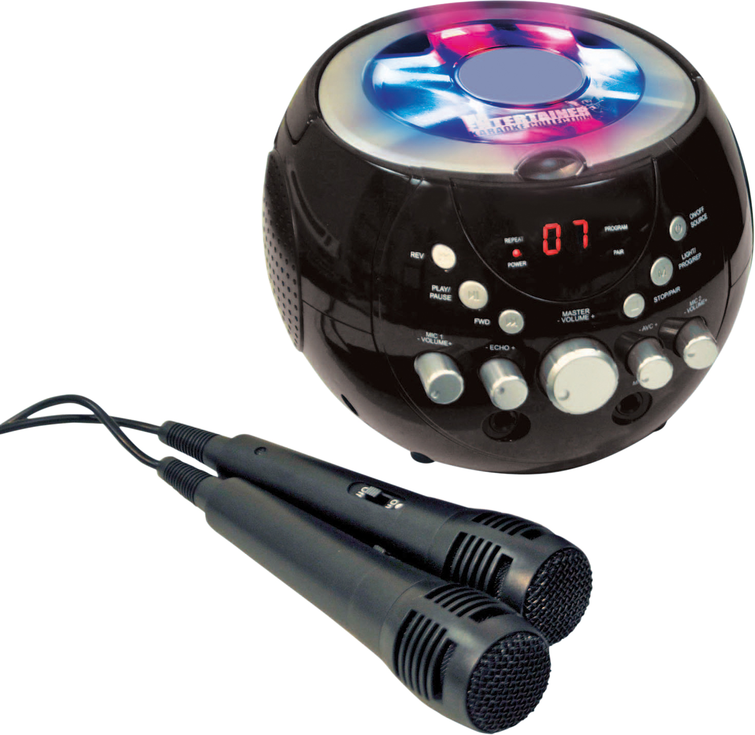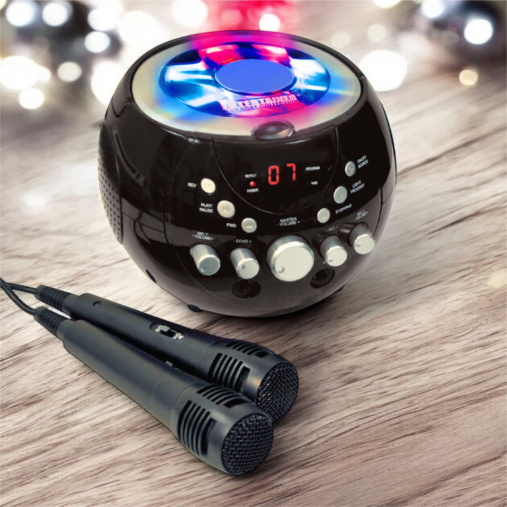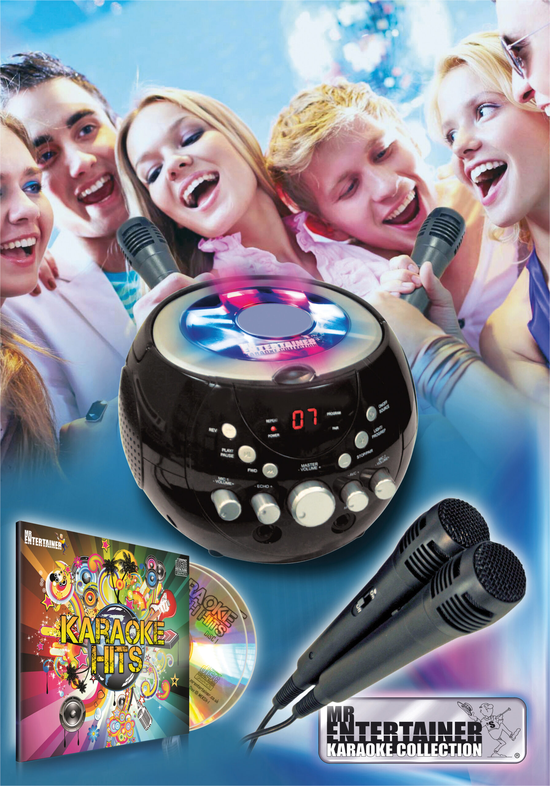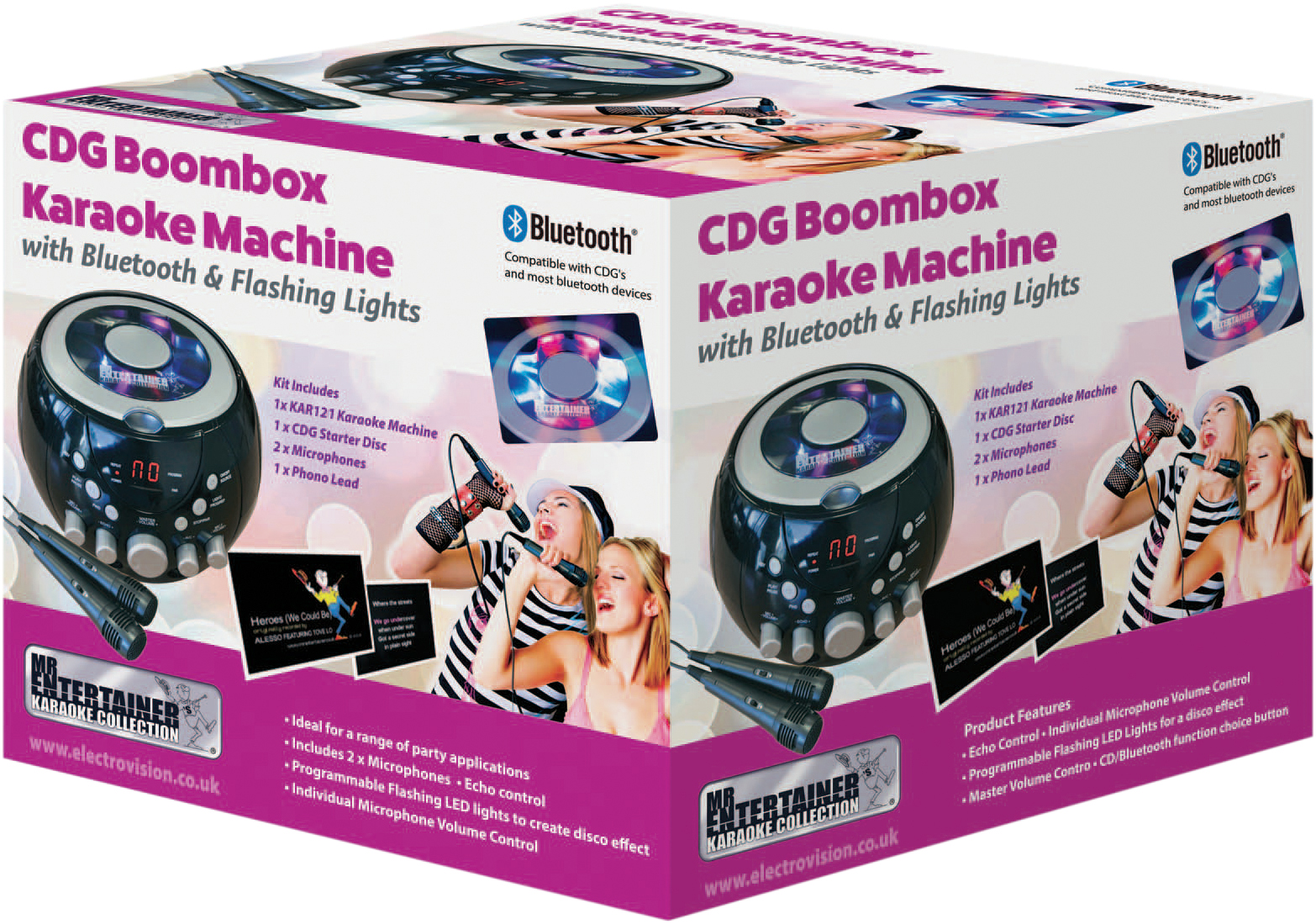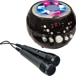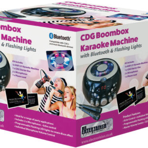Bring out your singing star from within with this portable karaoke kit. The machine features a lightweight boombox design making it portable. Ideal for parties, events or just singing your favourite songs at home. Two Microphones are included so melodies and harmonies can be achieved through your own dazzling duets. On the top of the machine there are multi coloured LED lights, which help create a disco effect feel to the system. The lights are programmable with ten different light movements at your disposal There are three ways to use this machine for karaoke purposes: Using the AV cable (RCA type)to connect to a TV. With this option simply insert a CDG into the system and view the lyrics as the backing tracks play. Simply use a karaoke CD with backing tracks included and sing along to your favourite hits using the internal speaker. Sync to a Bluetooth device such as a smartphone/iPad or Mp3 player and sing songs directly from your own music library. A CDG is a Compact Disc plus Graphics, which is merely a CD with information stored on a data track simultaneous to music. It has a video output for simple graphics (but not full music video). This is a useful karaoke tool as it stores graphics so they can be used with song lyrics, and display the lyrics in synch with the music. In most cases, CDG s display song lyrics, which change colour to determine time they are to be sung. A television with phono outputs is all that s required to display CDG lyrics. Comes with Echo Volume Control: This creates minor feedback in the voice of the karaoke singer, adding resonance to support the vocalist. The Kit Includes 1x KAR120 Karaoke Machine1 x CDG Popstar Karaoke HitsCD2 x microphones1 x phono wire. Product Features Echo Control, Individual Microphone Volume Control, Programmable Flashing LED Lights for a disco effect, Master Volume Control and Bluetooth function choice button. Supplied with a Double CDG Mr Entertainer Popstar Karaoke Hits to get you started.