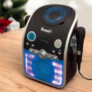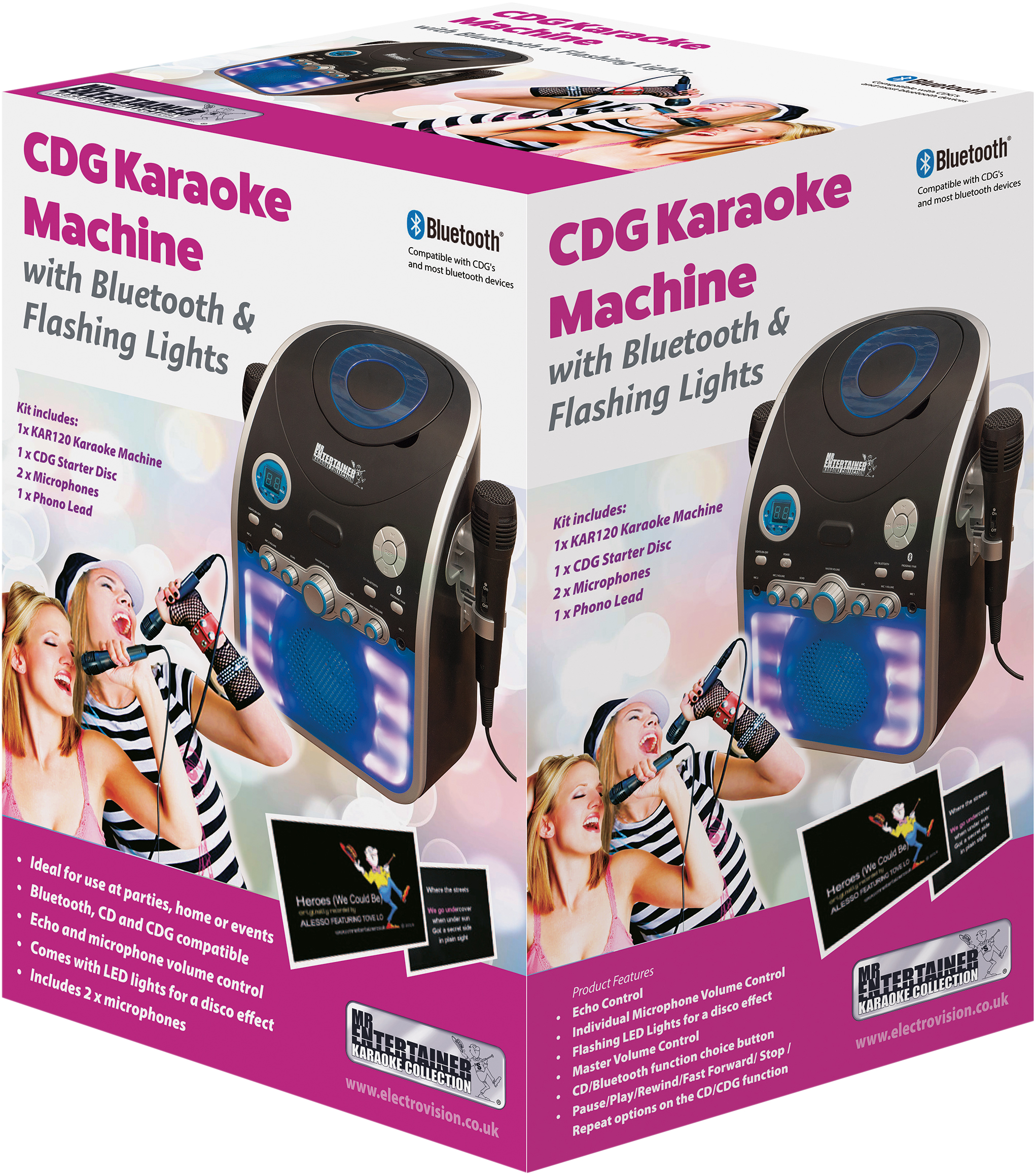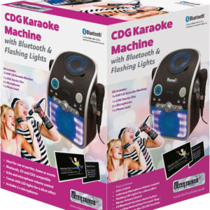 Bring back classic karaoke with a modern twist. This machine from Mr. Entertainer helps you bring back the contemporary classic concept of karaoke but this time it s possible from the luxury of your own living room. Ideal for use at parties due to it s portable nature, the two microphones included in this kit offer the option of setting up some dazzling duets. The disco lights offer a retro disco feel to your performance. Includes 1 x Double CDG Mr Entertainer Karaoke Hits. Track listing 7 Rings – Ariana Grande, Needy – Ariana Grande, Sweet But Psycho, Bury A Friend, Giant – Calvin Harris and Rag n Bone Man, Undecided – Chris Brow, Swan Song – Dua Lipa, Close To Me – Ellie Goulding and Diplo ft, Sucker – Jonas Brothers, Talk – Khalid, Hope Is A Dangerous Thing For A Woman Like Me To Have But I Have It – Lana Del Rey, I m So Tired – Lauv and Troye Siva, Two Of Us – Louis Tomlinson, Nothing Breaks Like A Heart – Mark Ronson ft. Miley Cyrus, Good Form – Nicki Minaj ft. Lil Wayne, Wow – Post Malone, Don t Feel Like Crying – Sigrid, Just You And I – Tom Walker, I Don t Belong In This Club – Why Don t We ft. Macklemore>20) No Candle No Light – Zayn ft. Nicki Minaj> CD Two>1) Break Up With Your Girlfriend, I m Bored – Ariana Grande>2) Thank U, Next – Ariana Grande>3) So Am I – Ava Max>4) Wish You Were Gay – Billie Eilish>5) Please Me – Cardi B & Bruno Mars>6) Say My Name – David Guetta ft. Bebe Rexha & J Balvin>7) In My Mind – Dynoro & Gigi D Agostino>8) Lost In The Fire – Gesaffelstein & The Weeknd>9) Nights Like This – Kehlani ft. Ty Dolla $ign>10) Saturday Nights (Remix) – Khalid ft. Kane Brown>11) More Than That – Lauren Jauregui>12) Someone You Loved – Lewis Capaldi>13) Don t Call Me Up – Mabel>14) Here With Me – Marshmello ft. CHVRCHES>15) Walk Me Home – Pink>16) Sunflower – Post Malone & Swae Lee>17) Who Do You Love – The Chainsmokers ft. 5 Seconds Of Summer>18) Hello My Love – Westlife>19) 11 Minutes – Yungblud & Halsey ft. Travis Barker>20) 365 – Zedd & Katy Perry There are three ways to use this machine for karaoke purposes: 1. Using the AV cable (RCA type) to connect to a TV. With this option simply insert a CDG into the system and view the lyrics as the backing tracks play. 2. Simply use a karaoke CD with backing tracks included and sing along to your favourite hits. 3. Sync to a Bluetooth device such as a smartphone/iPad or Mp3 player and sing songs directly from your own music library. A CDG is a Compact Disc plus Graphics, which is merely a CD with information stored on a data track simultaneous to music. It has a video output for simple graphics (but not full music video).This is a useful karaoke tool as it stores graphics so they can be used with song lyrics, and display the lyrics in synch with the music. In most cases, CDG s display song lyrics, which change colour to determine the time they are to be sung. A television with phono outputs is all that s required to display CDG lyrics. Kit Includes 1x KAR120 Karaoke Machine, 1 x CDG Starter Disc , 2 x microphones 1 x phono wires. Product Features Echo Control, Individual Microphone Volume Control, Flashing LED Lights for a disco effect, Master Volume Control CD/Bluetooth function choice button Pause/Play/Rewind/Fast Forward/Stop/Repeat options on the CD/CDG function
