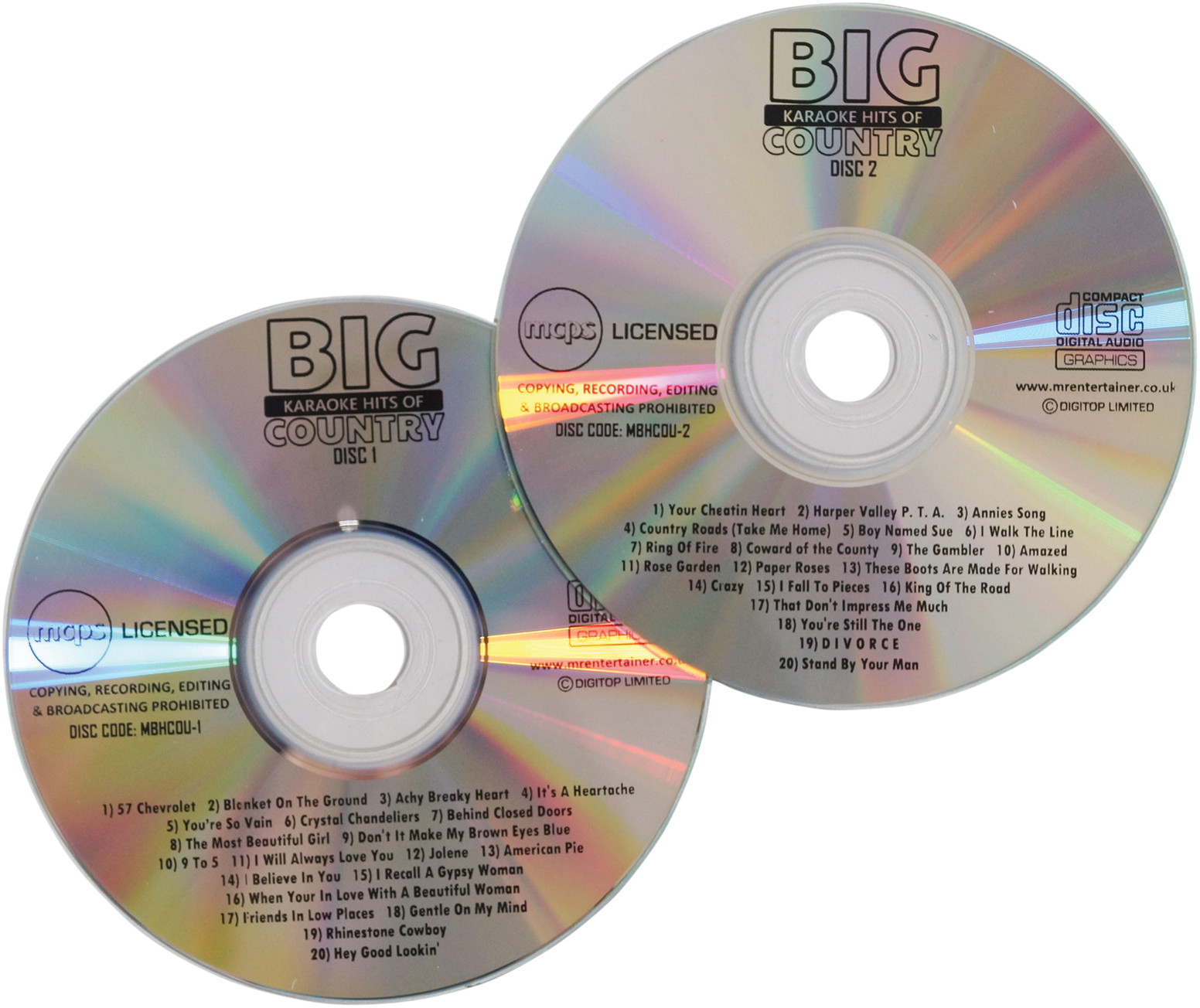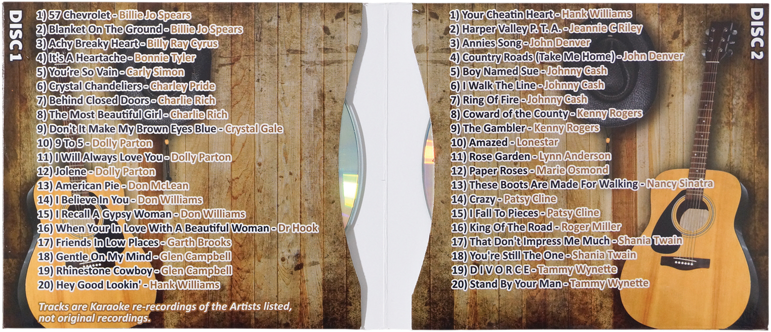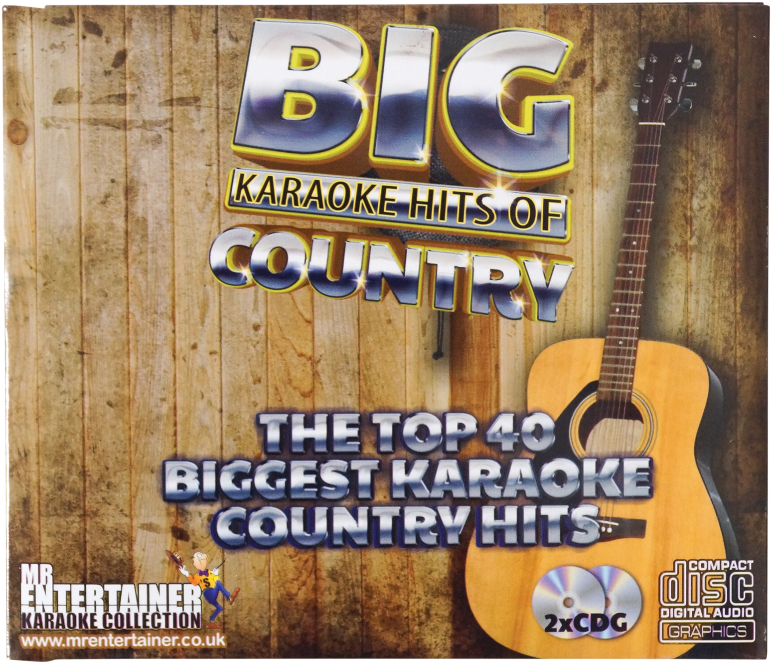 The Mr.Entertainer Karaoke CDG range offers a diverse selection of big hits from a range of musical styles and genres. This CDG gives the user 40 tracks from the best of country music throughout the years. Track Listing: 57 Chevrolet – Billie Jo SpearsBlanket On The Ground – Billie Jo SpearsAchy Breaky Heart – Billy Ray CyrusIt s A Heartache – Bonnie TylerYou?re So Vain – Carly SimonCrystal Chandeliers – Charley PrideBehind Closed Doors – Charlie RichThe Most Beautiful Girl – Charlie RichDon t It Make My Brown Eyes Blue – Crystal Gale9 To 5 – Dolly PartonI Will Always Love You – Dolly PartonJolene – Dolly PartonAmerican Pie – Don McLeanI Believe In You – Don WilliamsI Recall A Gypsy Woman – Don WilliamsWhen Your In Love With A Beautiful Woman – Dr HookFriends In Low Places – Garth BrooksGentle On My Mind – Glen CampbellRhinestone Cowboy – Glen CampbellHey Good Lookin – Hank WilliamsYour Cheatin Heart – Hank WilliamsHarper Valley P. T. A. – Jeannie C RileyAnnies Song – John DenverCountry Roads (Take Me Home) – John DenverBoy Named Sue – Johnny CashI Walk The Line- Johnny CashRing Of Fire – Johnny CashCoward of the County – Kenny RogersThe Gambler – Kenny RogersAmazed – LonestarRose Garden – Lynn AndersonPaper Roses – Marie OsmondThese Boots Are Made For Walking – Nancy SinatraCrazy -Patsy ClineI Fall To Pieces – Patsy ClineKing Of The Road – Roger MillerThat Don t Impress Me Much – Shania TwainYou re Still The One – Shania TwainD I V O R C E – Tammy WynetteStand By Your Man – Tammy Wynette