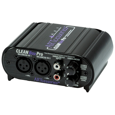 The CLEANBoxPro provides two channels of unbalanced to balanced level conversion and two channels of balanced to unbalanced level conversion in a rugged, compact, and portable unit. Balanced lines offer increased immunity to external electrical noise, such as hum. Since a balanced system minimizes induced noise, it is the preferred method of connecting audio gear, especially when long lengths of cable are used. One section of the CLEANBoxPro converts two channels of consumer-level unbalanced input signals into two channels of pro line-level balanced output signals. It has two RCA jack inputs and a stereo mini-phone jack input connected in parallel. The balanced output feeds two XLR male jacks.