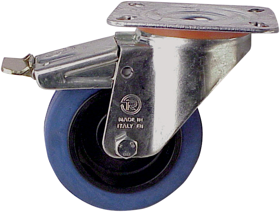 Tough swivel castor with a foot operated brake and a pliable but highly resilient tyre on a plastic centre hub. Safe running load (per set of four) 220 kg.