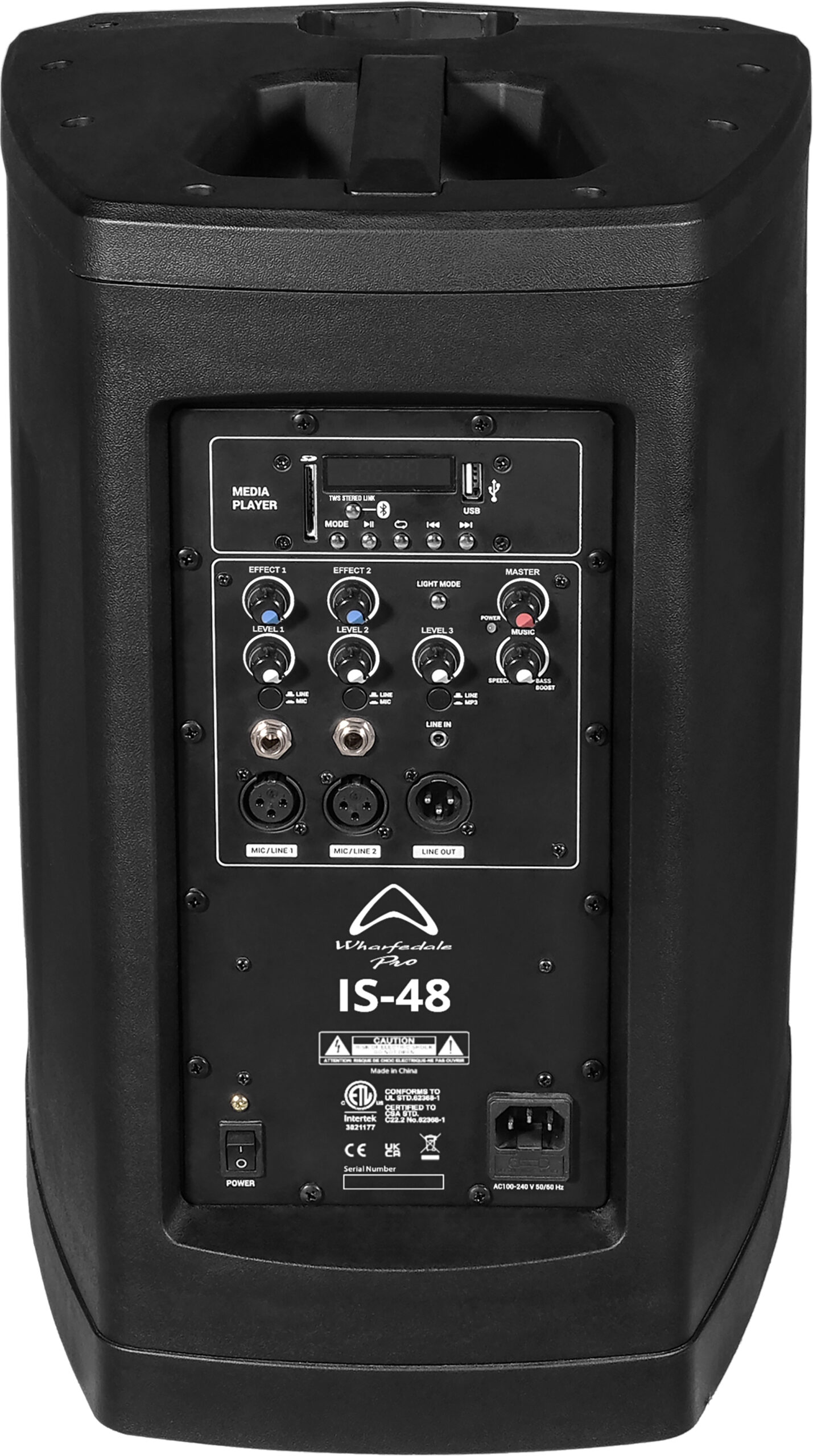 Portable, practical, powerful and, when needed, eye catching – the new IS-48 Active Entertainment System is a real ‘party animal’….perfect for mobile performers and entertainers. The system is quickly constructed from 3 interlocking column elements and an 8″ active subwoofer. This 8″ active subwoofer unit is the heart of the system and delivers the amplification power up to the full range column element, and also hosts the versatile internal mixer and media player module. Two of the column elements are for dynamic LED lighting effects. With four eye catching modes (plus an ‘LED OFF’ mode) the IS-48 is a real ‘party animal’. With SD card, USB and Bluetooth inputs plus IR Remote control, the system caters for all kinds of media … for all kinds of events. With easy TWS system pairing, it’s also possible to wirelessly connect 2 units of IS-48 together for a full stereo system. Analogue mic and line inputs and internal mixing functions also mean that the system is versatile enough.