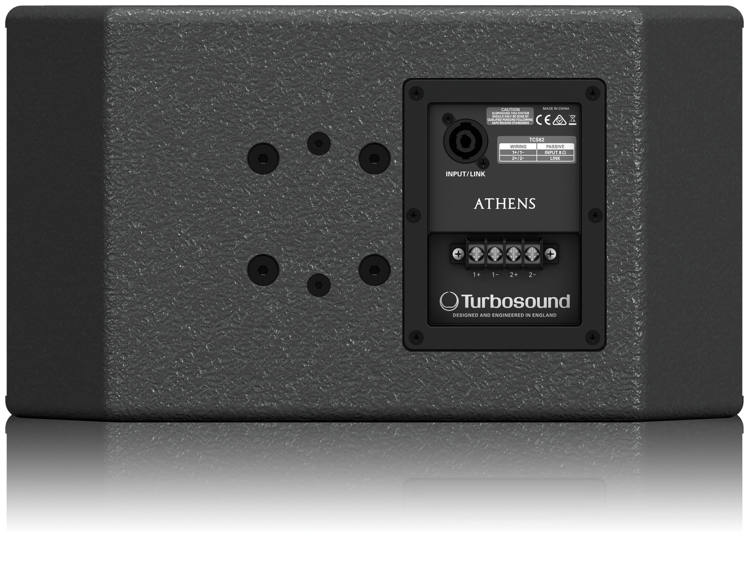The 2 way full range TCS62 is a compact passive 6.5 700 Watt arrayable loudspeaker system that is ideally suited for a wide range of speech and music sound reinforcement applications. Designed to work in conjunction with TURBOSOUND loudspeaker management systems, the TCS62 provides optimal infill, front and downfill performance and the compact size makes it an exceptional choice for under balcony and monitoring applications. TCS62 arrayable loudspeaker features a carbon fibre loaded 6.5 low frequency driver with a low mass voice coil for improved transient response and an aluminium dome 1 neodymium motor compression driver mounted on a 100° horizontal by 60° vertical converging elliptical waveguide. When the waveguide is rotated 90° from the standard position, a 60° horizontal by 100° vertical dispersion is achieved, making TCS62 ideal for an even broader range of applications. All drivers are matched with an internal passive crossover network in a reflex-loaded enclosure. The rear panel connector plate carries Neutrik Speakon* NL4 and barrier strip connectors for input and link connections to additional enclosures. Finished in a highly durable semi matt black paint, the cabinet is constructed from 12 mm (½) birch plywood and includes a rugged powder coated perforated steel mesh grille backed with reticulated foam. Internal M8 and M6 threaded rigging points are provided for suspension in any orientation, or mounting with dedicated brackets – available separately.