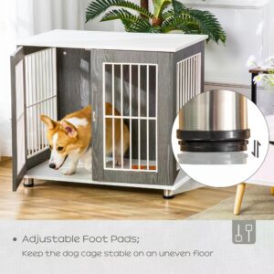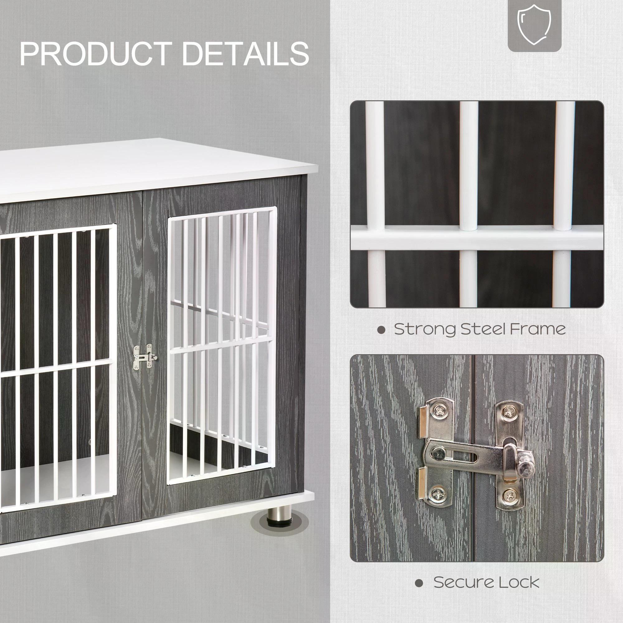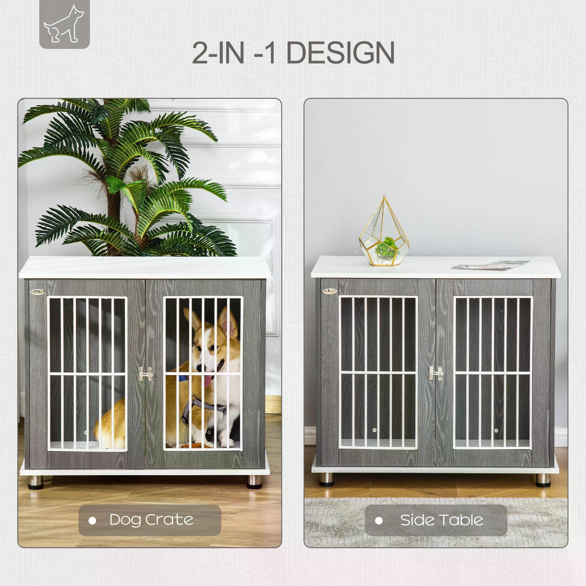 A secure PawHut cage fused with a side table ?? your dog has a comfortable spot to rest, whilst you have a spacious and stylish tabletop to display your favourite pieces ?? the two colours of grey and white will fit in well with your home d??cor. Your pet will have a front door for easy access and there’s a lock, so they’ll will remain put ?? the steel bars keep them secure and gives you a 270?¨ view so you can keep watch. Made from particle board, it’s durable and can be used daily.