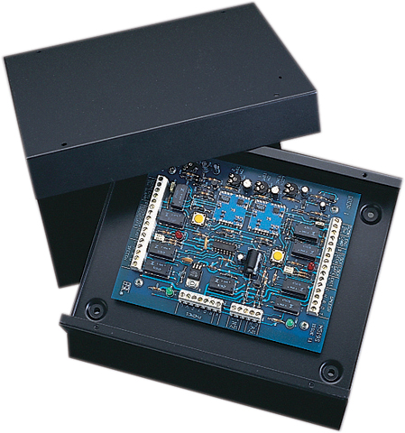 This unit allows the operation of a door entry system from two entrances. Several units may be combined to extend operation up to a maximum of eight entrances. When a telephone is called from a given entrance, the switching unit connects the telephone to the speech unit of that panel only for a fixed period (adjustable 25-230 seconds). During this time pressing the lock release button on the telephone will operate the lock of the calling door only. Boxed.
