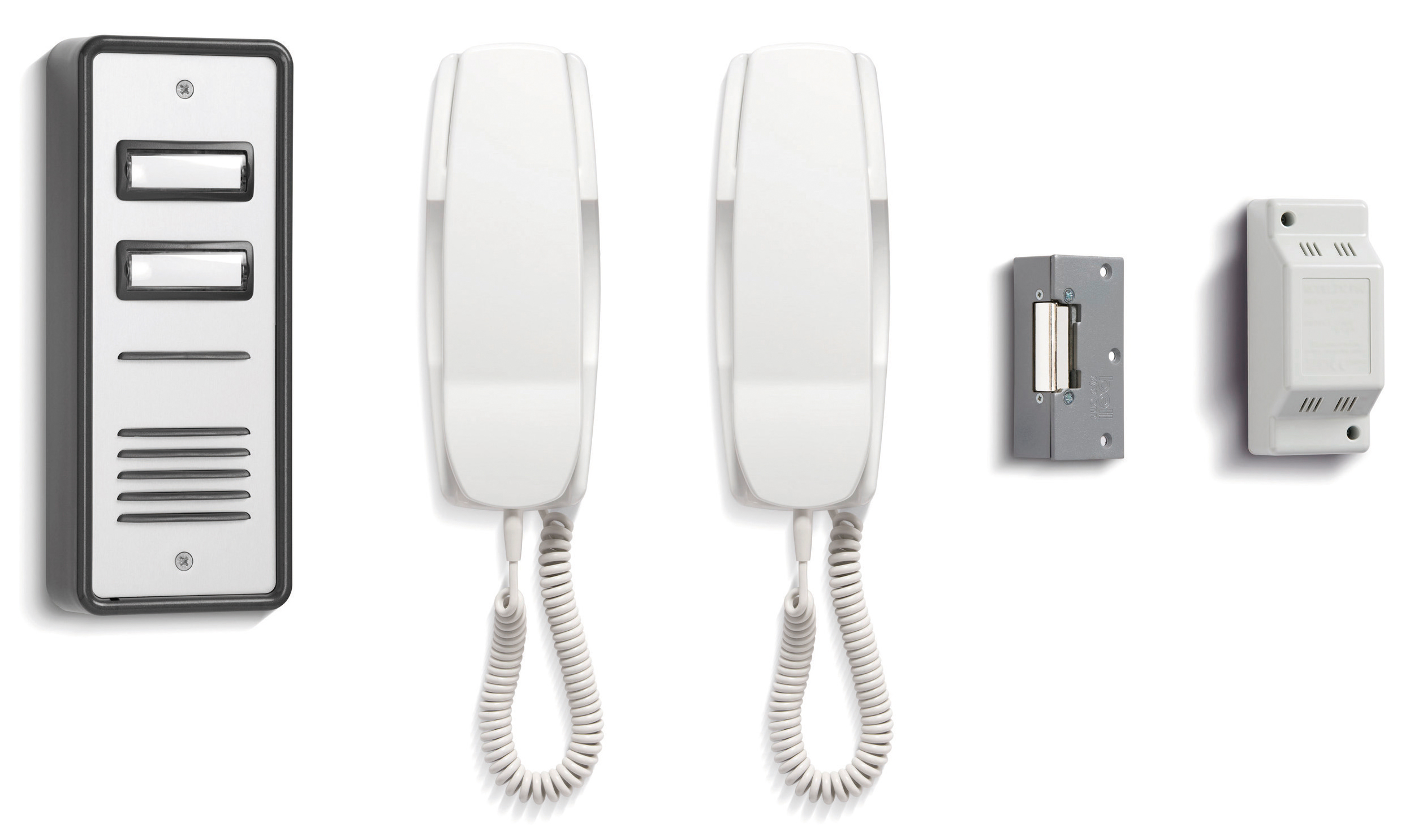 Door entry kit comprising 2 telephone handsets with a lock release button, outside 2 way surface mounting door station with name plate, aluminium tamper resistant plate, transformer, door release lock and full wiring instructions.