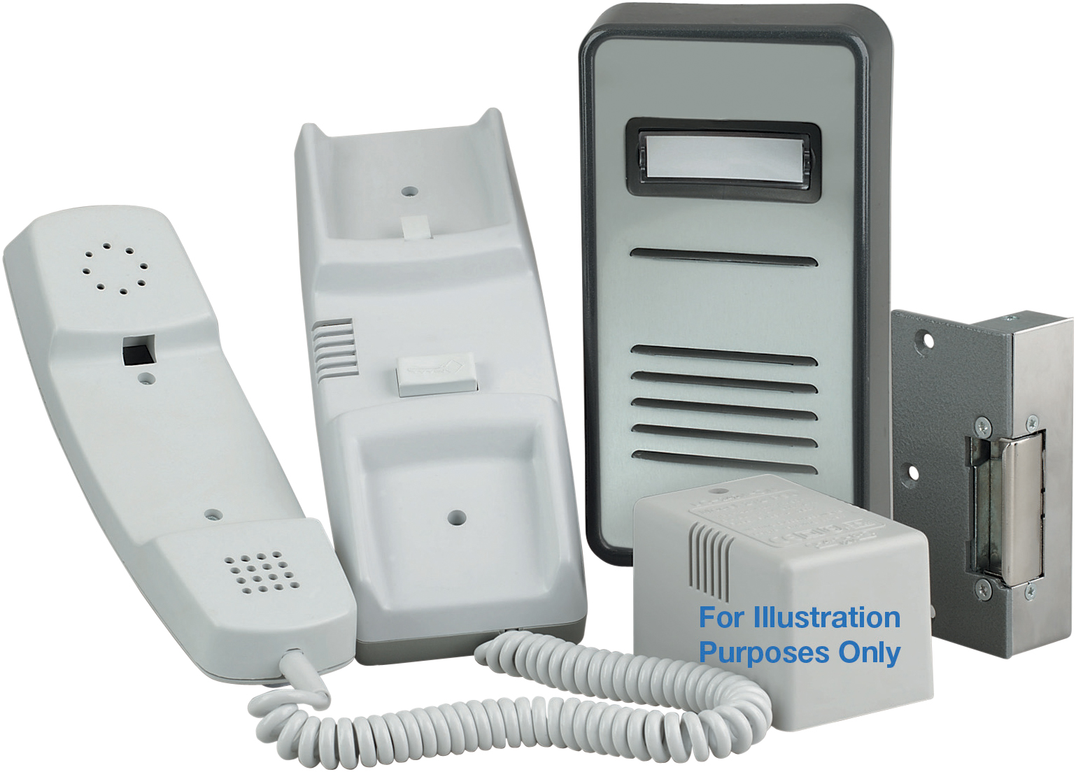 Door Entry kit comprising 7 telephone handsets with a lock release button, outside 7 way surface mounting door station with aluminium tamper resistant plate and name plate, transformer, door release lock and full wiring instructions.