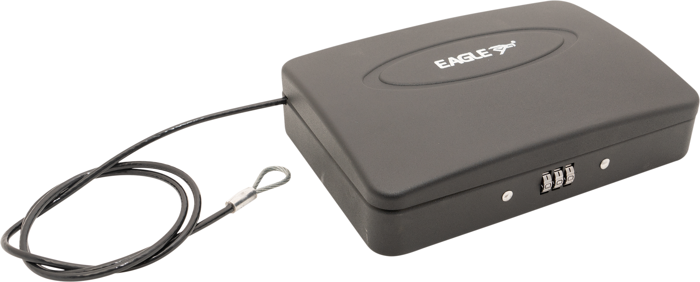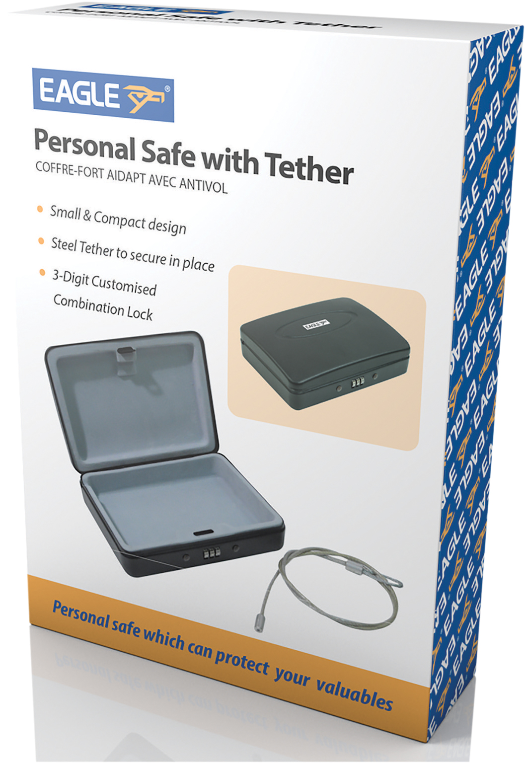 The Eagle Personal Safe with tether is ideal for keeping your personal items safe and secure wherever you go. A well designed and constructed product which includes a looped locking steel cable (Tether) approx. 930 mm long. Easy to use, simply loop the wire through the retaining loop around a secure object and secure the personal safe via the locking nut. Designed with a 3-digit combination lock which can be customized to a code of your choice, the safe is now fixed and not going anywhere! Perfect peace of mind.