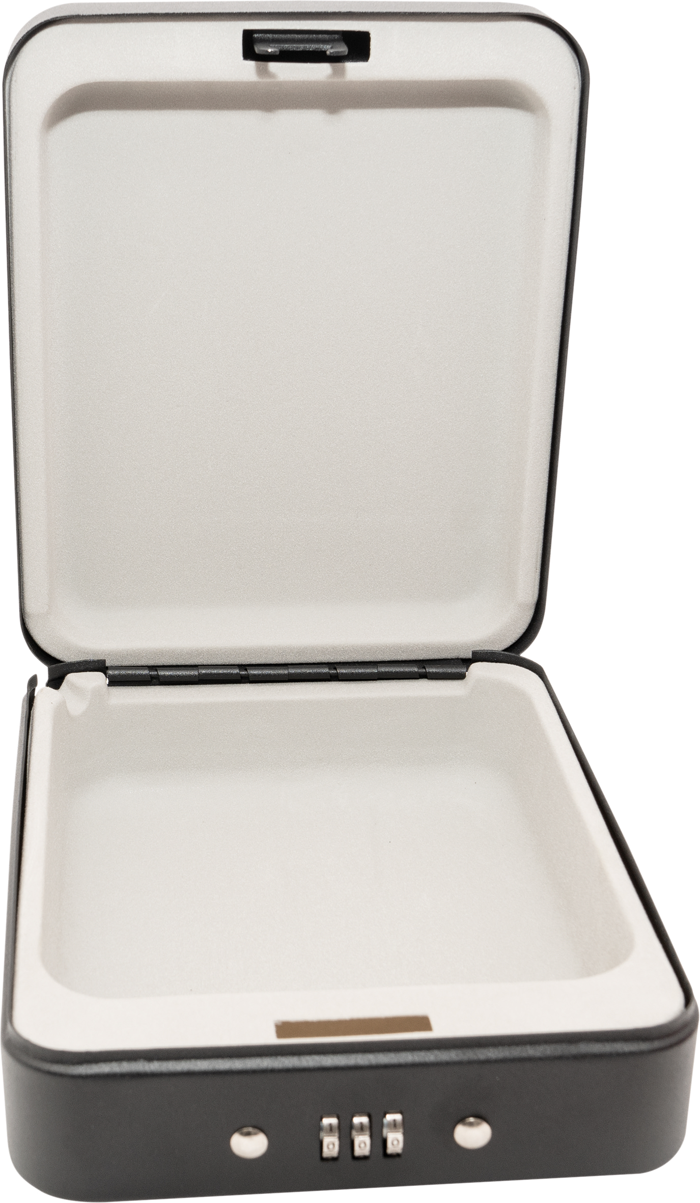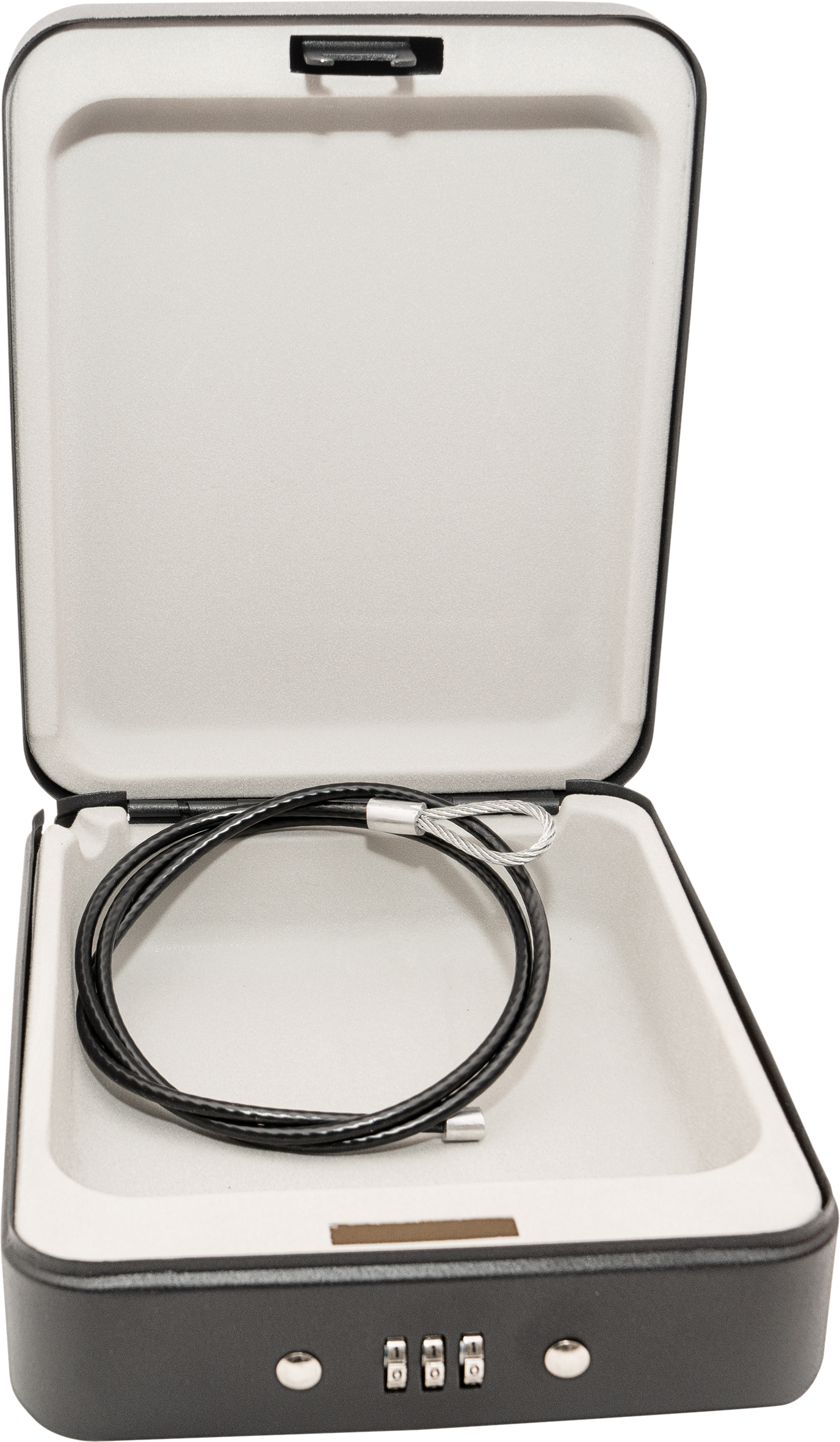 The Eagle Personal Safe with tether is ideal for keeping your personal items safe and secure wherever you go, ideal for holidays, dorm rooms, nursing homes etc. A well designed and constructed product which includes a looped locking steel cable (Tether) approx. 900 mm long. Extremely easy to use, simply loop the wire through the retaining loop around a secure object and secure the personal safe via the locking nut. Designed with a 3-digit combination lock which can be customized to a code of your choice, the safe is now fixed and not going anywhere! Perfect peace of mind.