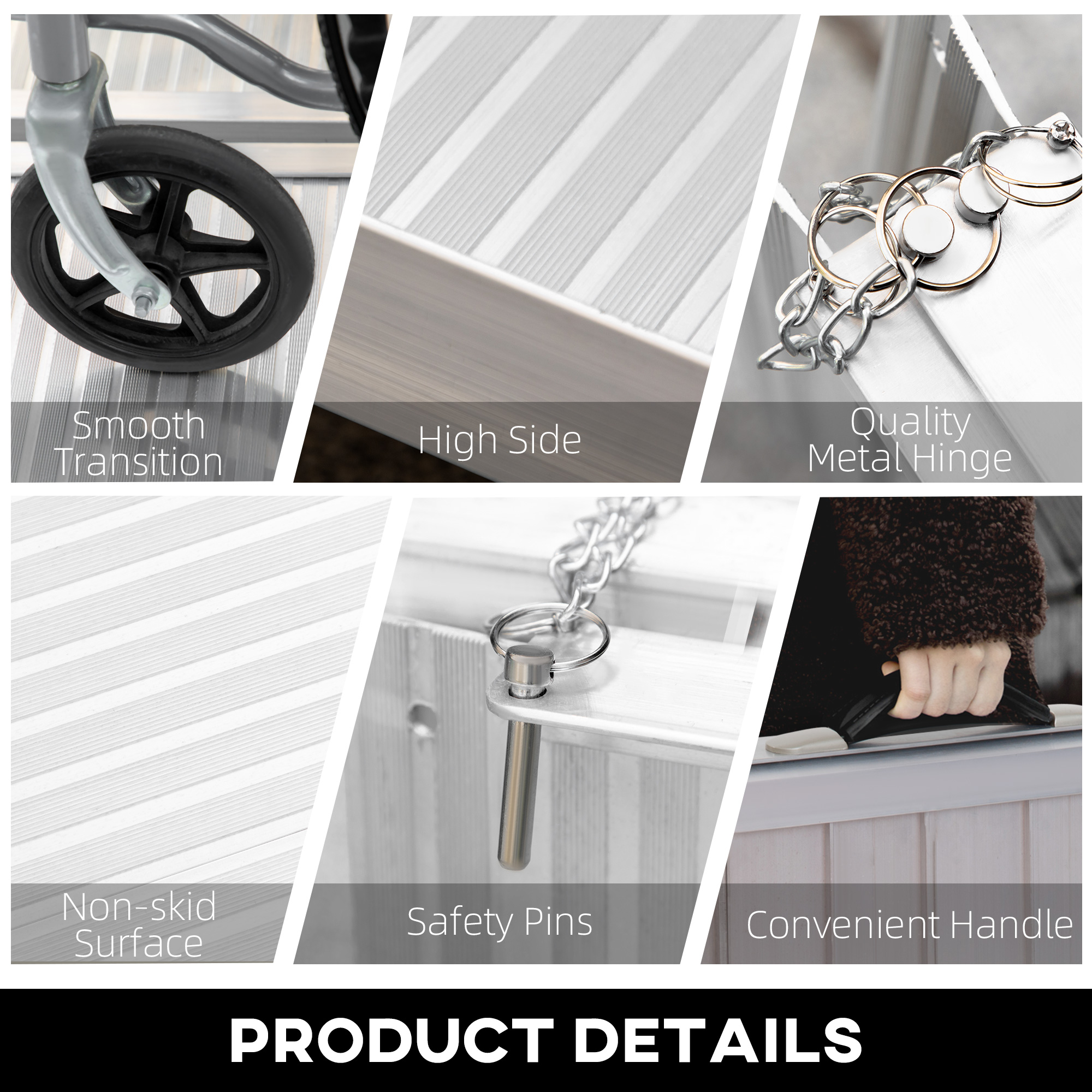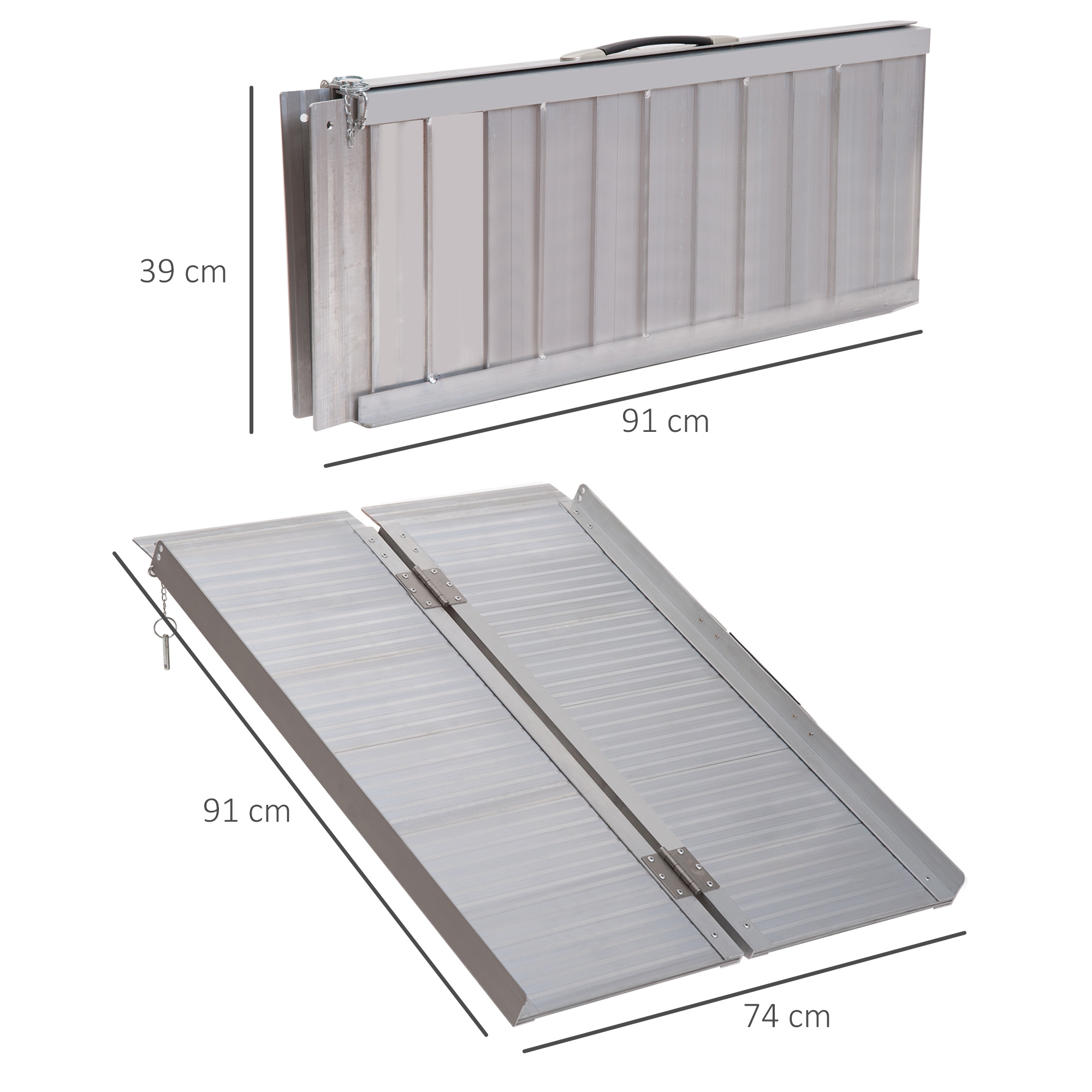 Get easier access to raised surfaces with this wheelchair ramp from HOMCOM. Covered with skidproof surface to prevent slipping, making it ideal for any weather condition. When not in use, the mobility scooter ramps can be easily folded, saving space and enabling storage in the vehicle or at home. The durable aluminium frame is anti-corrosive to last for years of usage. This door ramp can be used with wheelchairs, lawn mowers, scooters or any other heavy item that may have trouble with stairs.