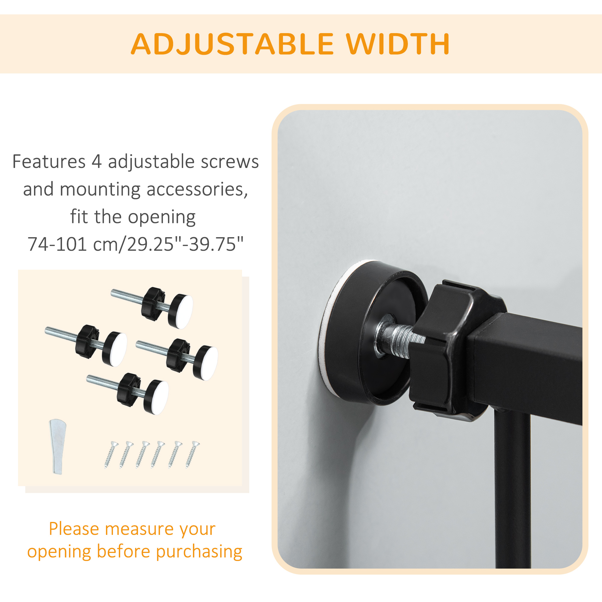 - Overall Dimension: 74 – 101W x 104.1H cm (With adjusting screws). 68W x 104.1H cm(Without adjusting screws)