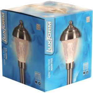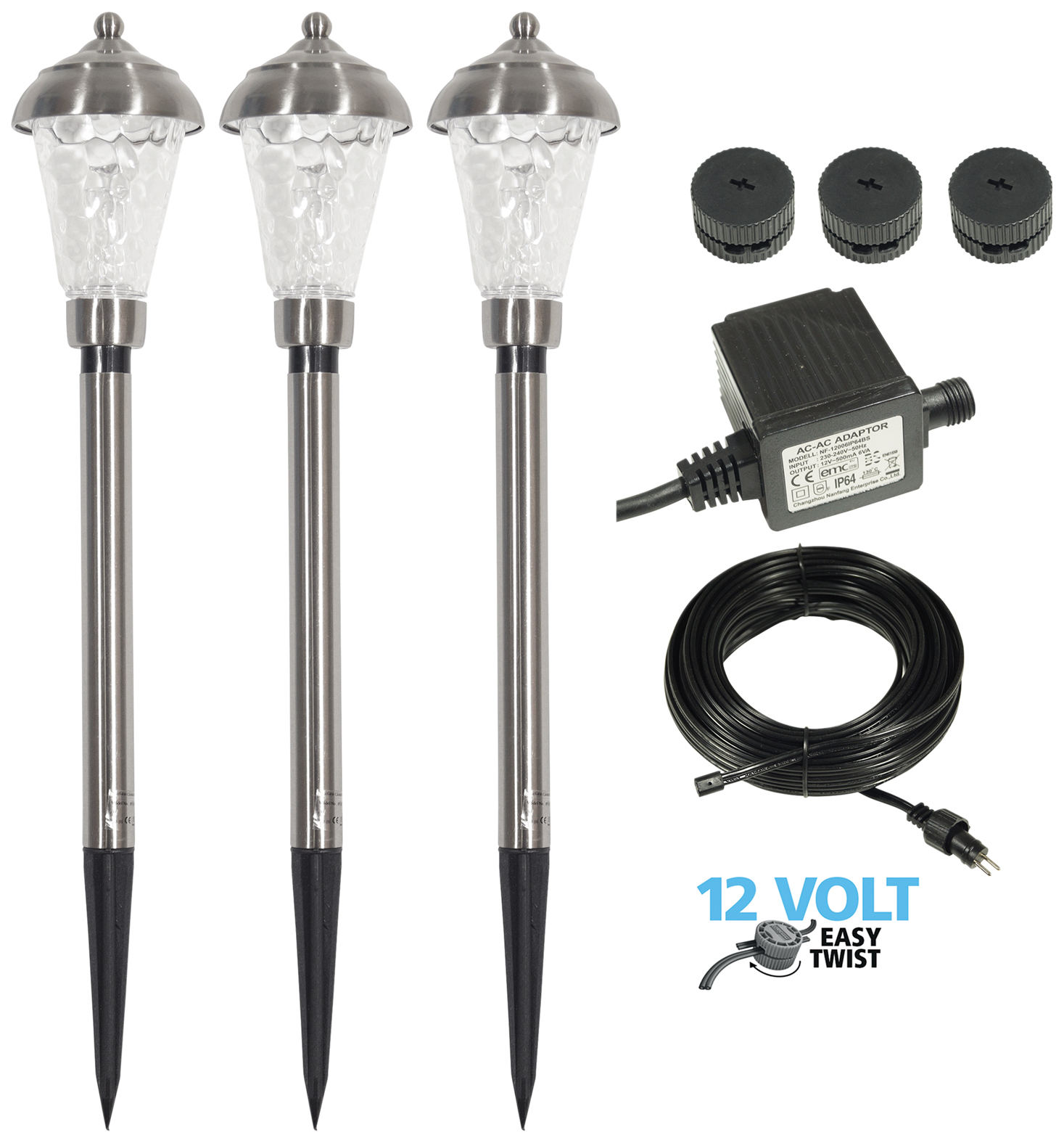 These garden spike lights are suitable for atmospheric illuminating of walkways and darkened areas at night it will mark along driveways, garden paths, terraces and porches. These lights are supplied with a ground spike so that the light can be easily placed into soil. This starter kit contains 3 lights, a 10 metre mains cable, cable connectors and a 6w transformer with extra capacity onto which you can add extra lights. This light works on the flexible Luxform Easy Twist 12V connection system, which is safe for children and animals. Everyone can create an atmospheric garden with this garden spike starter kit. Please remember that stainless steel is not a maintenance free product and that you need to clean the lights every 6 months to prevent discolouration.