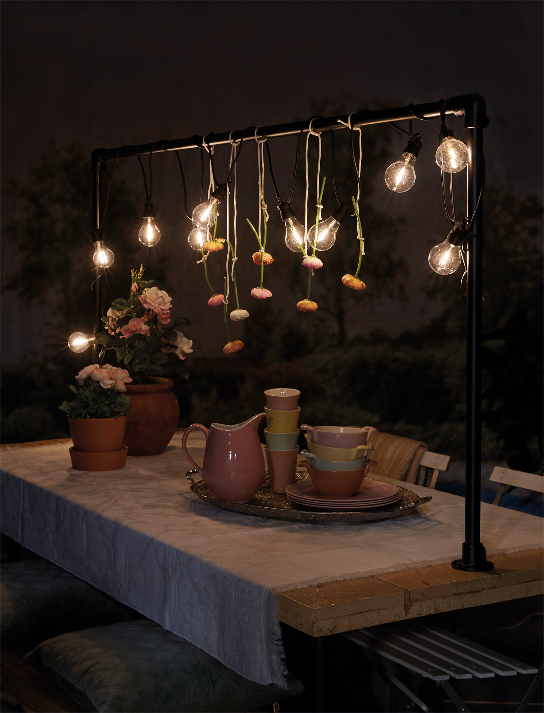 This cozy party lighting from Luxform Lighting is equipped with an ultra safe 24V transformer. The set is supplied with 10 clear G60 bulbs which offer a super stylish look thanks to the filament bulb. A bonus feature is that it s connectable with all the other sets of lights from this range, up to 3 sets of lights can be connected to the one supplied transformer .A 5 metre extension cable is also included with the 6w 24V transformer. Bulbs are placed every 50cm with a very generous total cable length of 10 metres.
