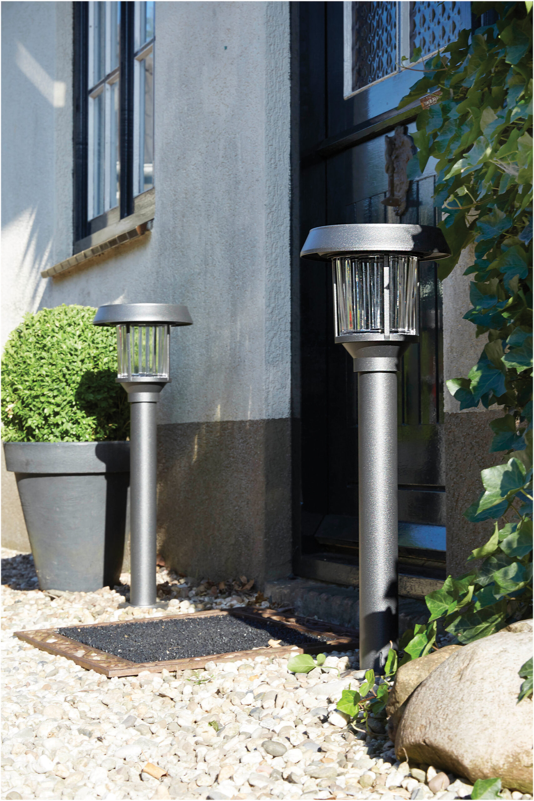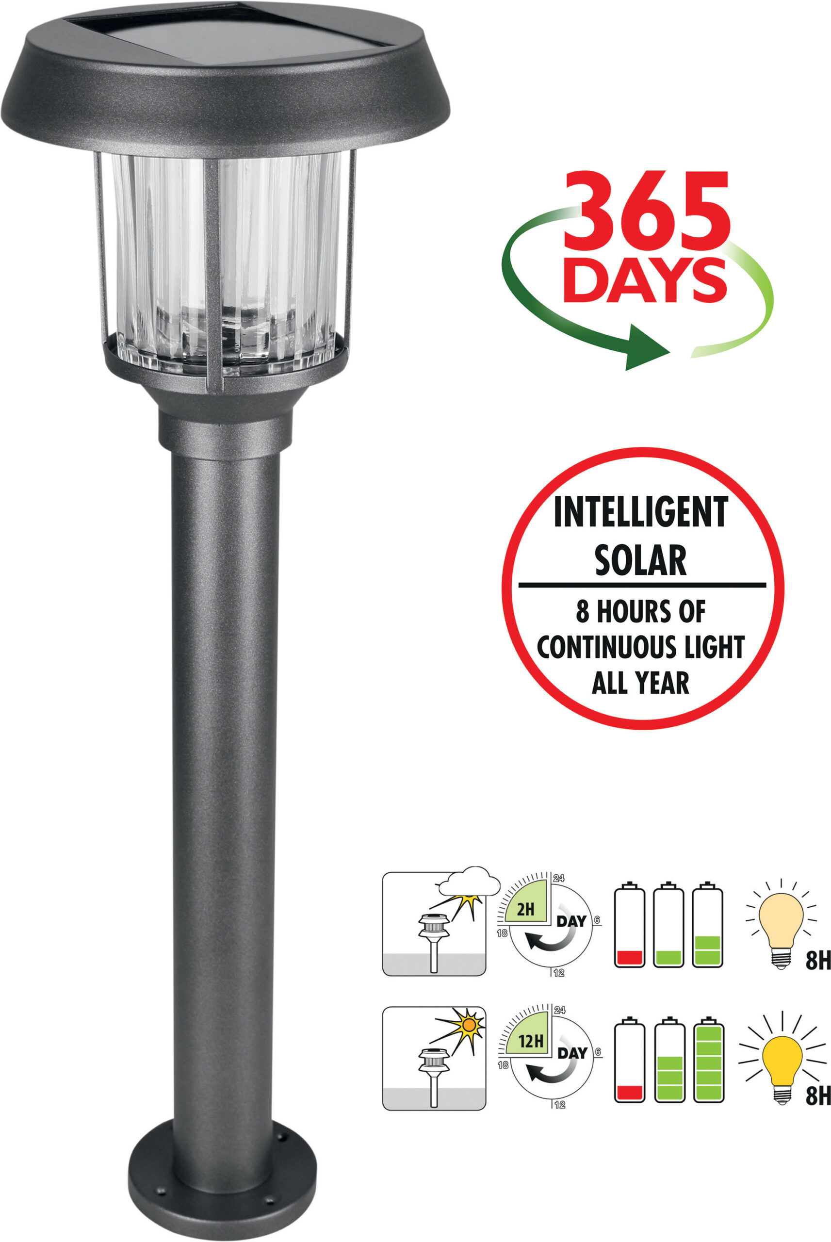 Decorate your outdoor living space even in remote areas by placing these stylish lights in a sunny spot, they will enhance the look and feel of any garden. This solar light is made from durable aluminium and stainless steel and has an on/off switch, it can also be used to provide ambient light sufficient to illuminate paths, borders and driveways etc. All of the lights in the Intelligent LED Solar Series – are equipped with a self-thinking system, which distributes the stored energy evenly over the number of hours the light is in use. The battery charges during daylight hours using free energy from the sun via the integral solar panel. The light automatically switches on at dusk and then the intelligent electronics inside the light detects and calculates the battery capacity and always distributes this energy capacity evenly over an 8-hour period. This means that when the battery has less charge, the light will not be as bright, as it will adapt to the power reserve in the battery. The big advantage of this feature is that it guarantees 8 hours of light every night, 365 days a year* * Guaranteed, unless the battery will not charge sufficiently due to overcast skies for more than 3 days.