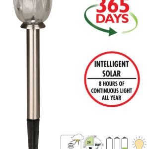 Decorate your outdoor living space even in remote areas by placing these stylish lights in a sunny spot, they will enhance the look and feel of any garden. This solar light is made from durable stainless steel and can also be used to provide ambient light sufficient to illuminate paths, borders and driveways etc. All of the lights in the Intelligent LED Solar Series – are equipped with a self-thinking system, which distributes the stored energy evenly over the number of hours the light is in use. The battery charges during daylight hours using free energy from the sun via the integral solar panel. The light automatically switches on at dusk and then the intelligent electronics inside the light detects and calculates the battery capacity and always distributes this energy capacity evenly over an 8-hour period. This means that when the battery has less charge, the light will not be as bright, as it will adapt to the power reserve in the battery. The big advantage of this feature is that it guarantees 8 hours of light every night, 365 days a year* * Guaranteed, unless the battery will not charge sufficiently due to overcast skies for more than 3 days.