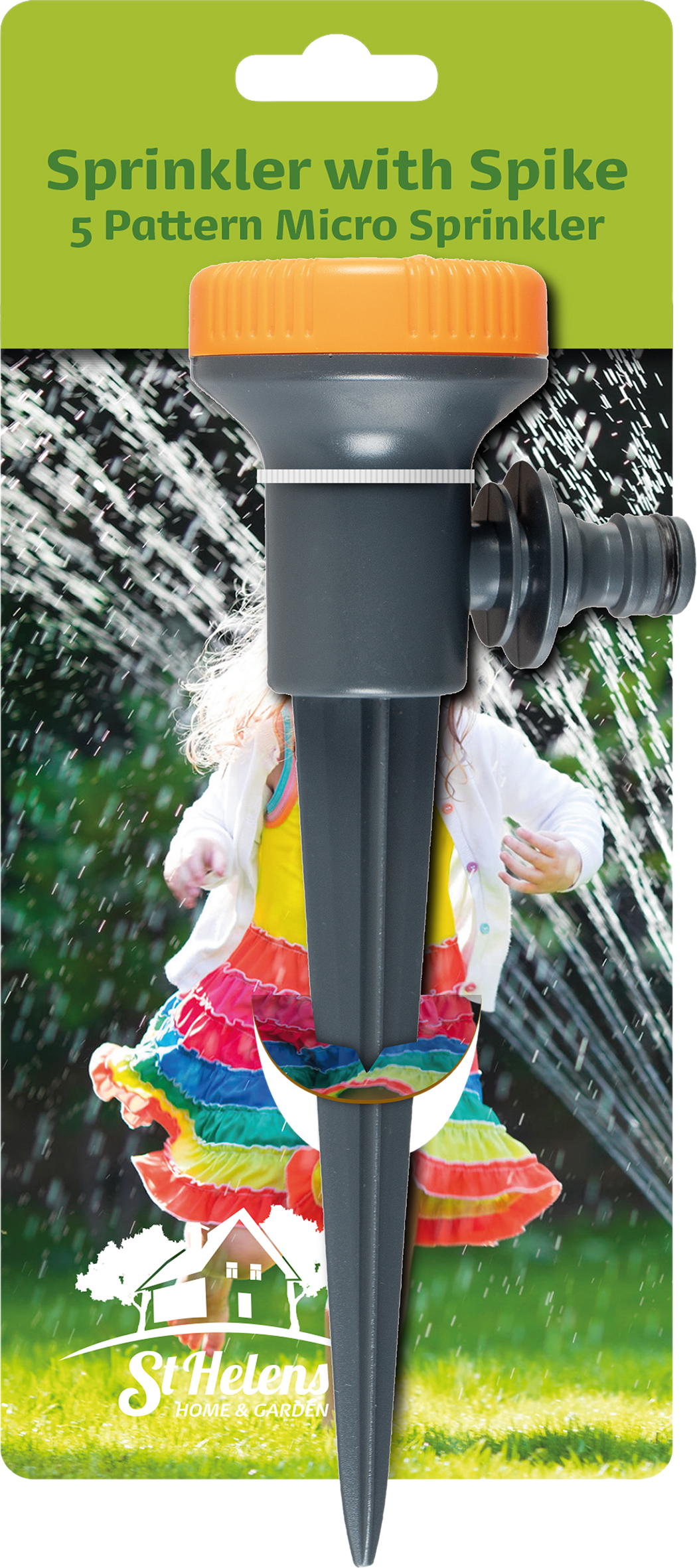 Garden Lawn Sprinkler. Choose from 5 spray patterns by twisting the nozzle. Simply place in the ground with the attached ground spike and attach a hose pipe using the connector at the side. Perfect for watering your lawn and plants and keeping your children cool on warm days! The maximum coverage area in a home with 4 bar water pressure is 161m2.