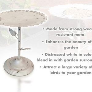 This ornamental pedestal bird bath from St Helens Home and Garden will enhance the beauty of any garden and attract a large variety of wild birds all year round. The bath is a beautiful distressed white colour meaning it will blend in seamlessly with your garden surroundings. Made from strong and durable, weather resistant metal giving you many years of use. The bird bath is freestanding so simply place in a prominent position in your garden and watch the wild birds as they come and go.