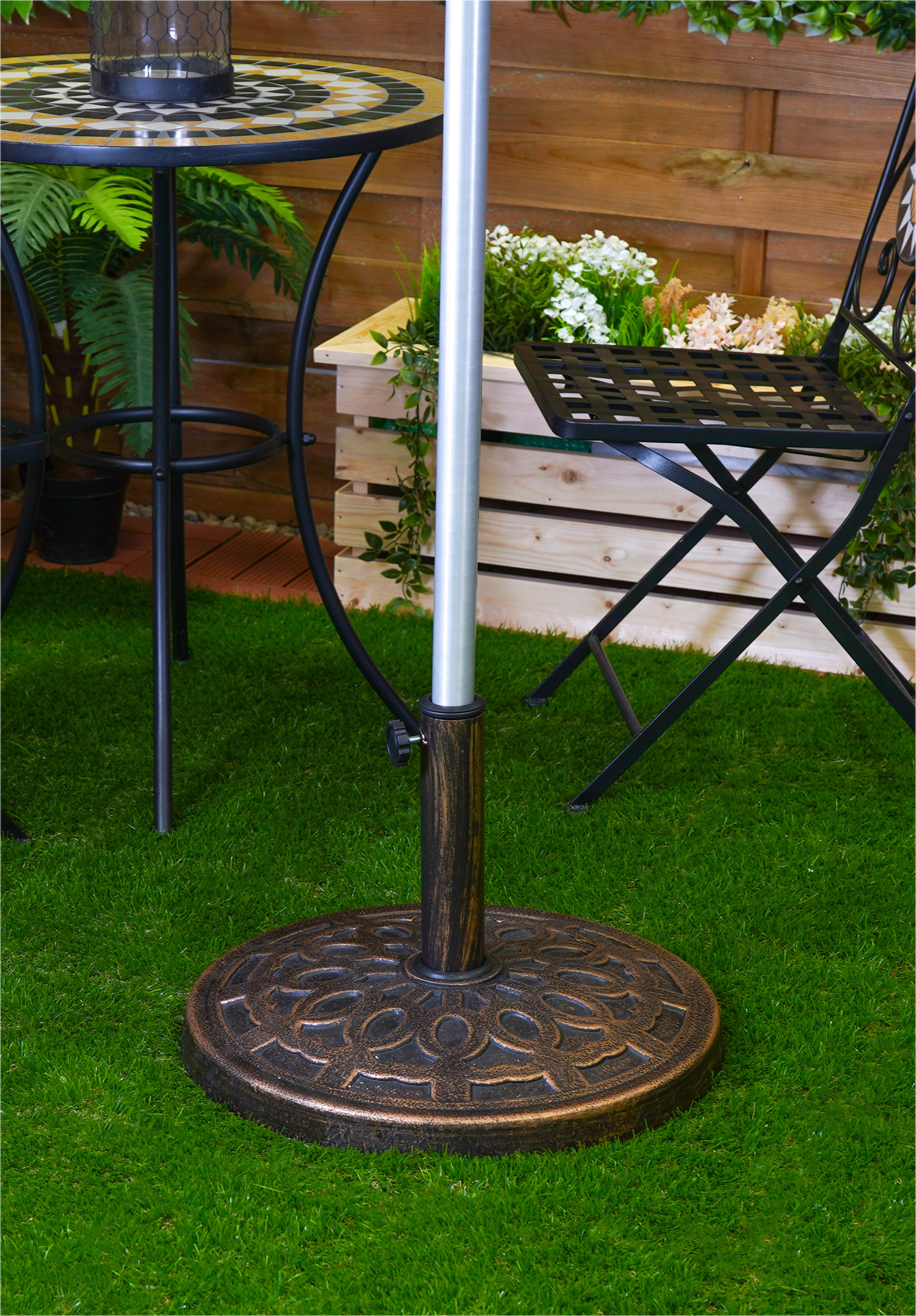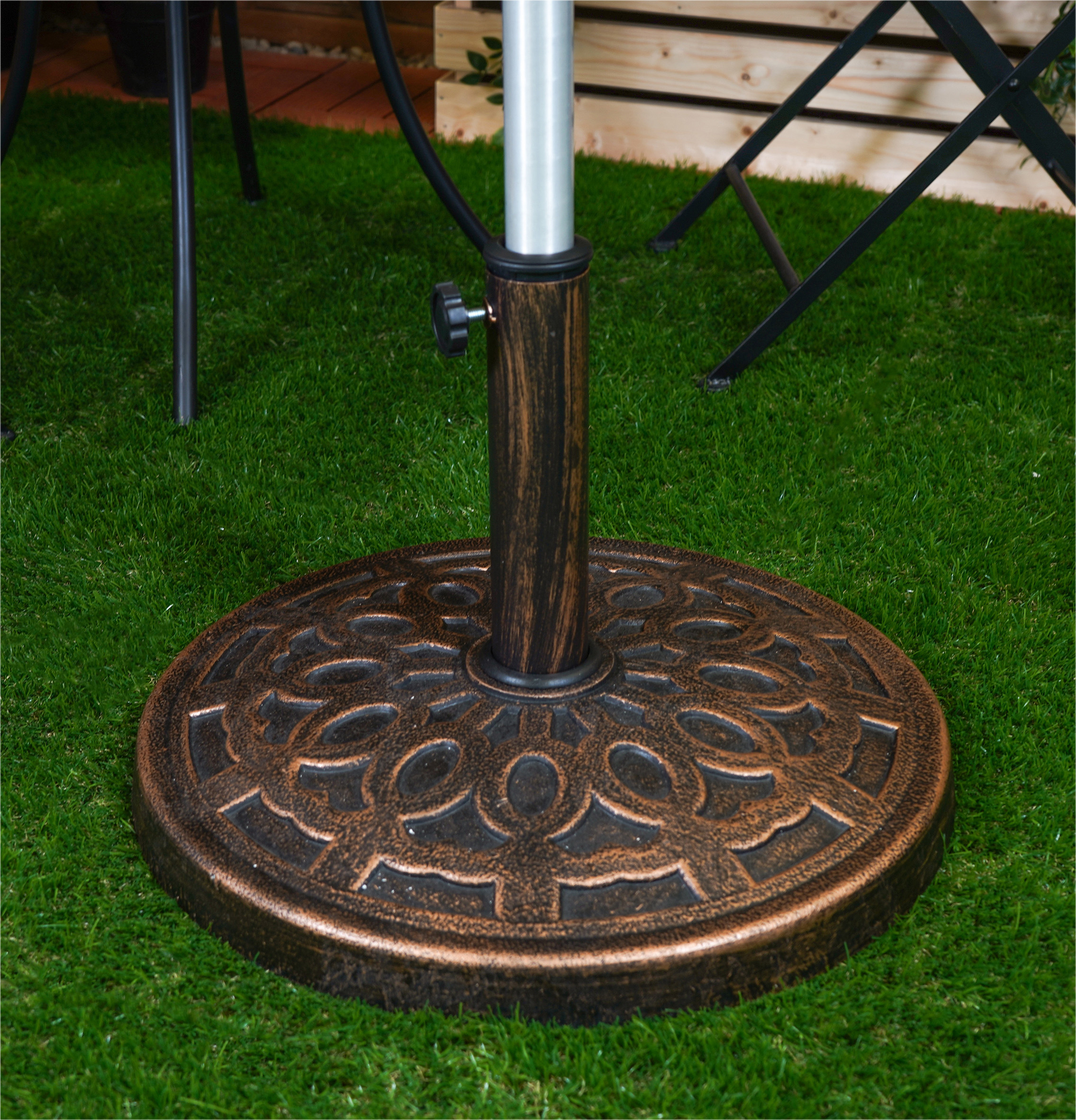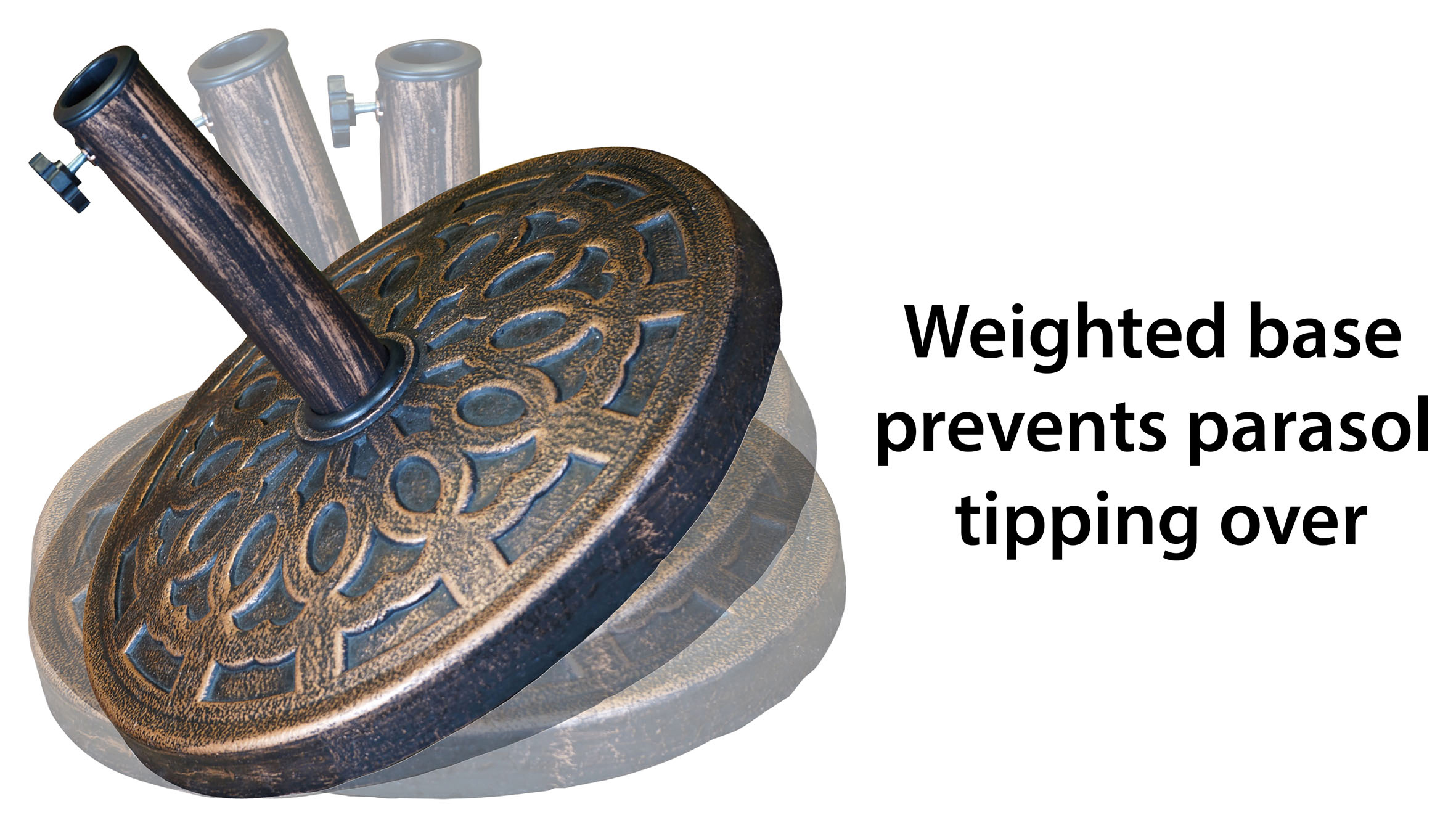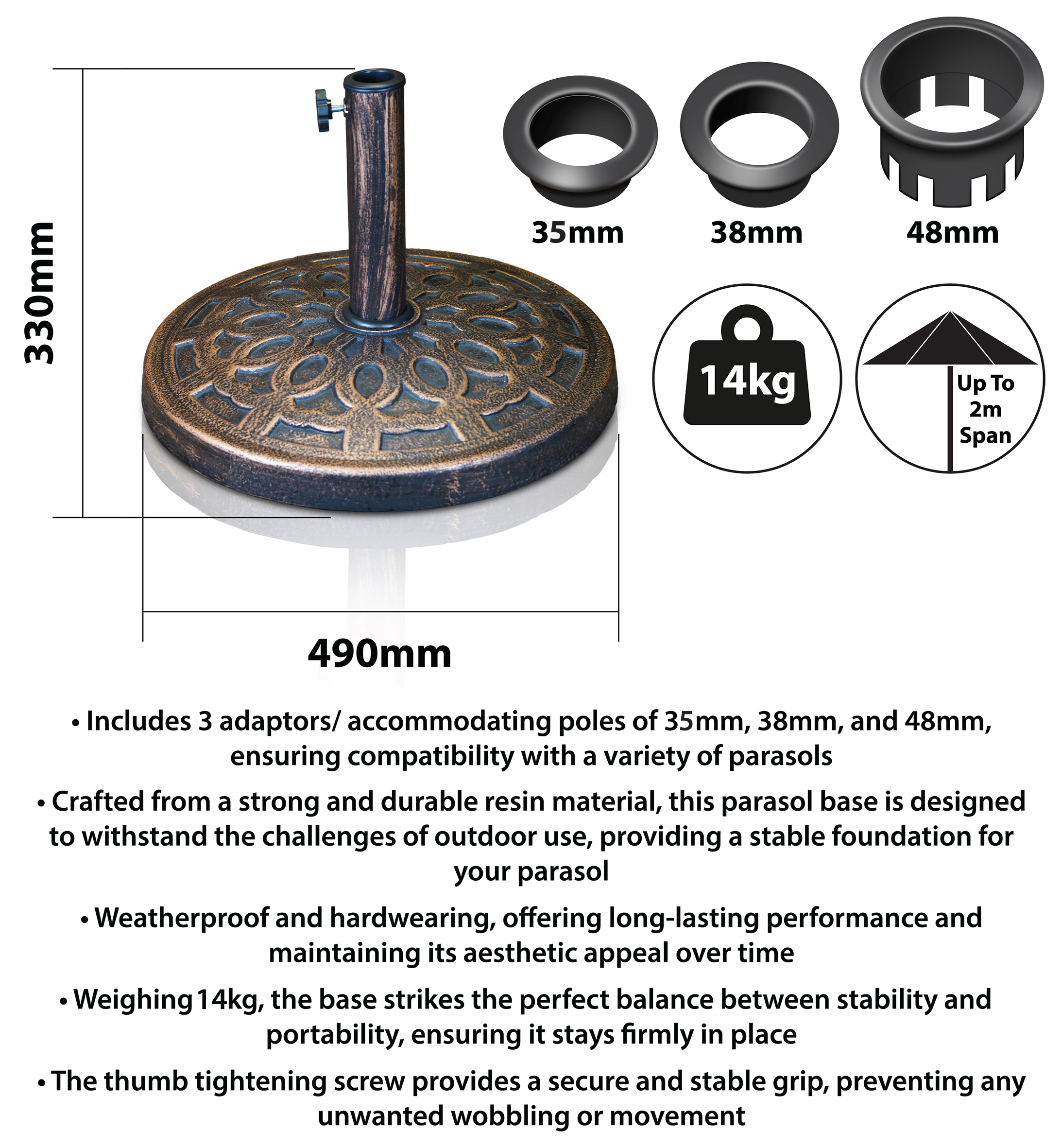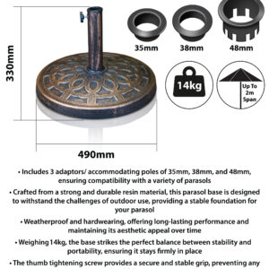 - Robust Construction: Crafted from a strong and durable resin material, this parasol base is designed to withstand the challenges of outdoor use, providing a stable foundation for your parasol.