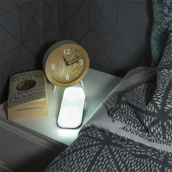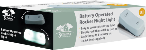 St Helens Home and Garden Battery operated (3 x AA Not supplied) table top rocker night light. Simply rock the body of the light to turn it on or off. Ideal for use at night on bedroom side tables to give a generous amount of light.