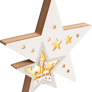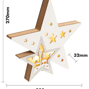 The battery powered light up Christmas Star from St Helens Home and Garden is a beautiful festive addition to your window sill, table top or office desk. The star is made from wood, there is an interlocking mini star which features a Christmas scene and is edged in silver glitter, both stars are backlit by LED lights creating a cosy glow. The star would also make a thoughtful gift for your family and friends. 27cm in height. Simply insert 2x AA batteries (not supplied) and you are ready to go. Made from wood sourced from an FSC accredited manufacturer