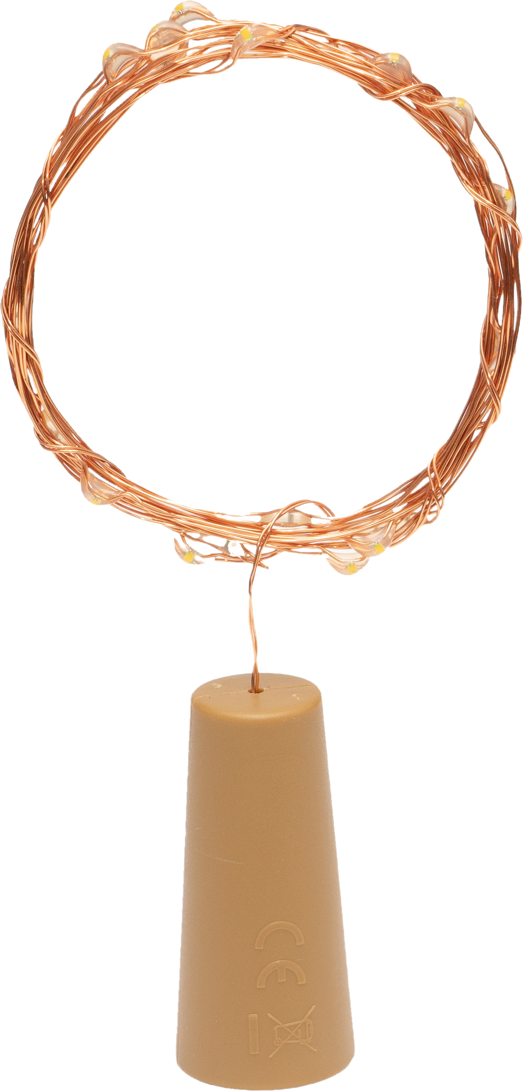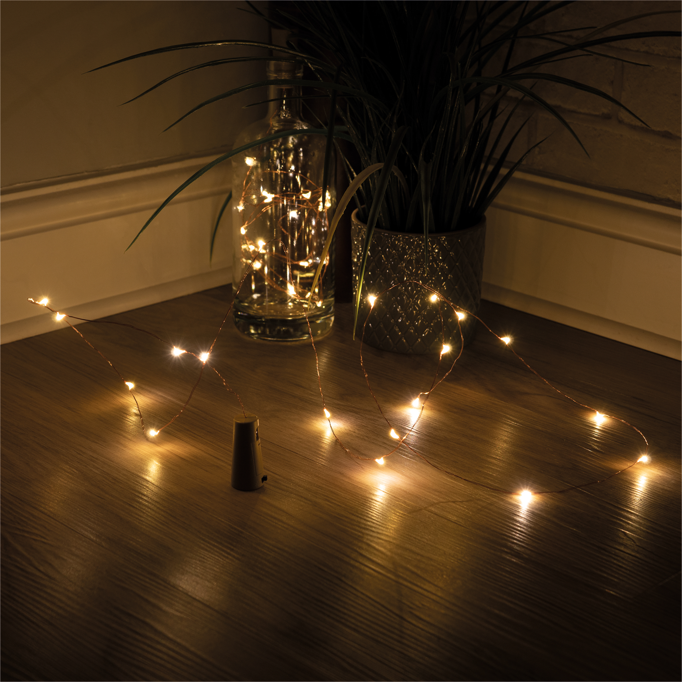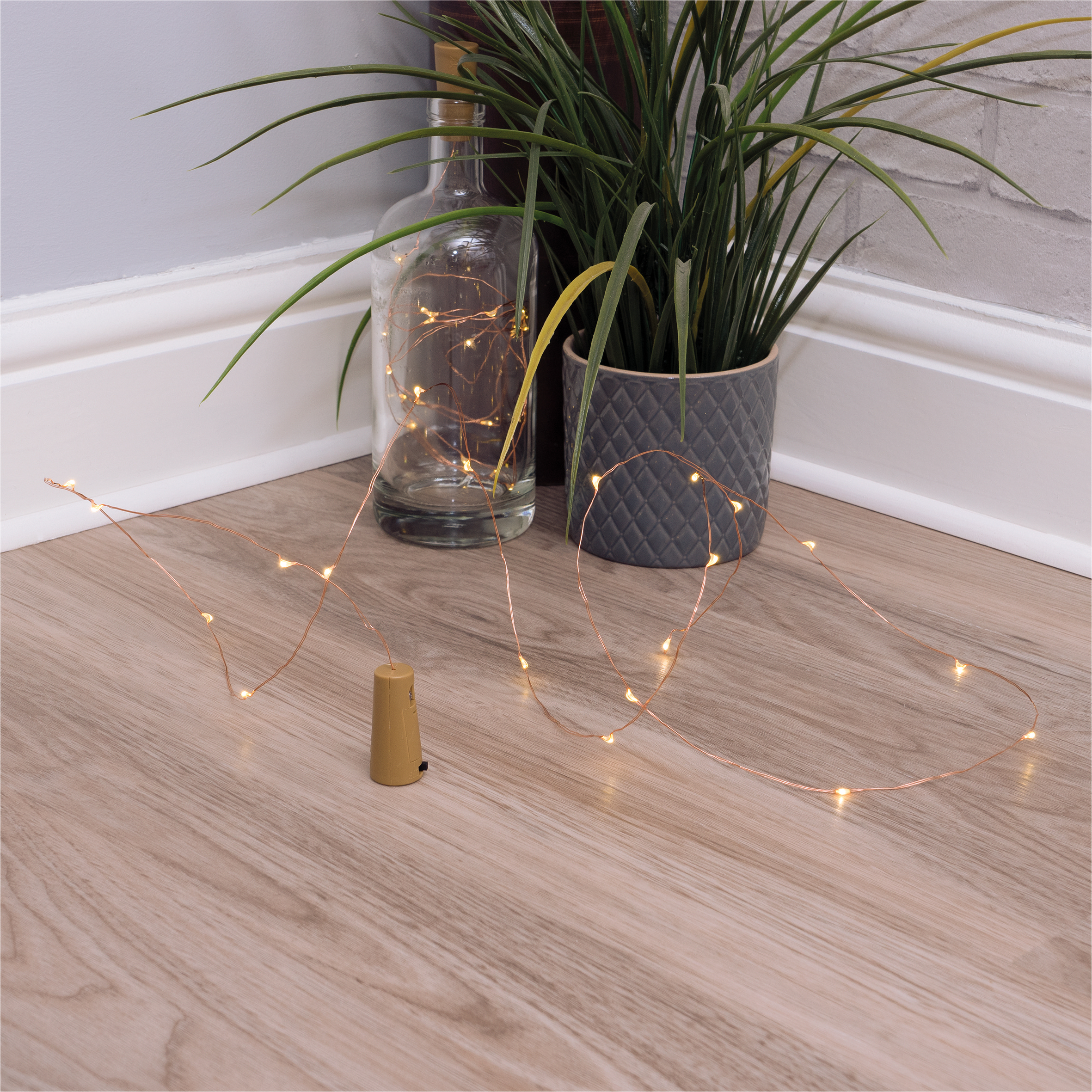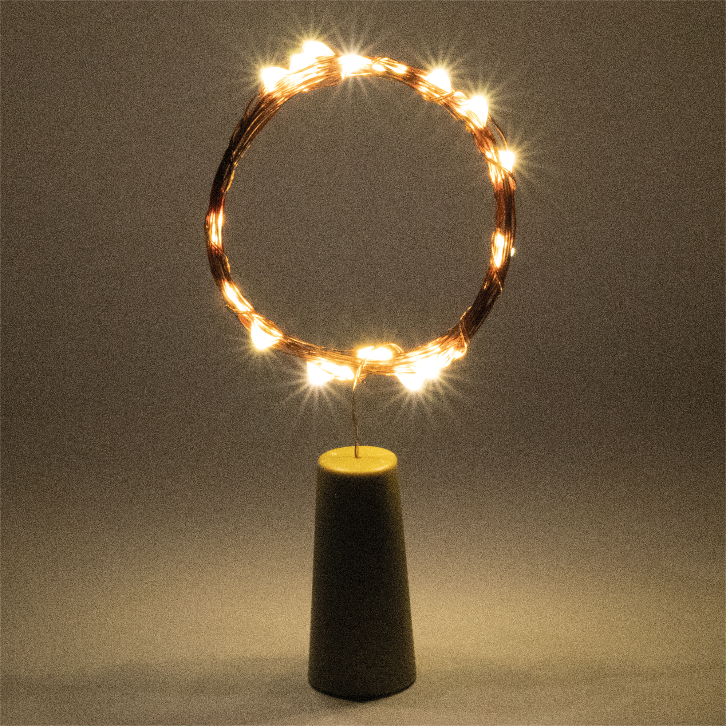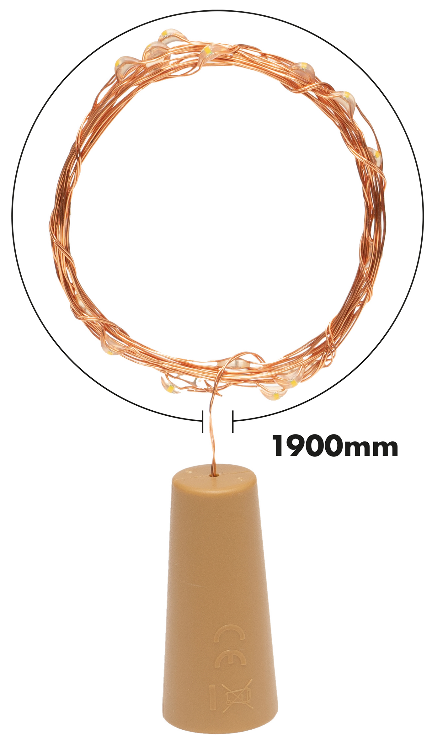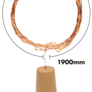 A simple but effective light effect which can transform empty bottles into attractive lamps and unique table displays .Designed with a cork-shaped stopper and a generous 1.9m copper wire this string light fits easily into most bottle types, uses 3 x LR44 batteries (included) simply place into an empty bottle, switch on and off using the switch on the cork.