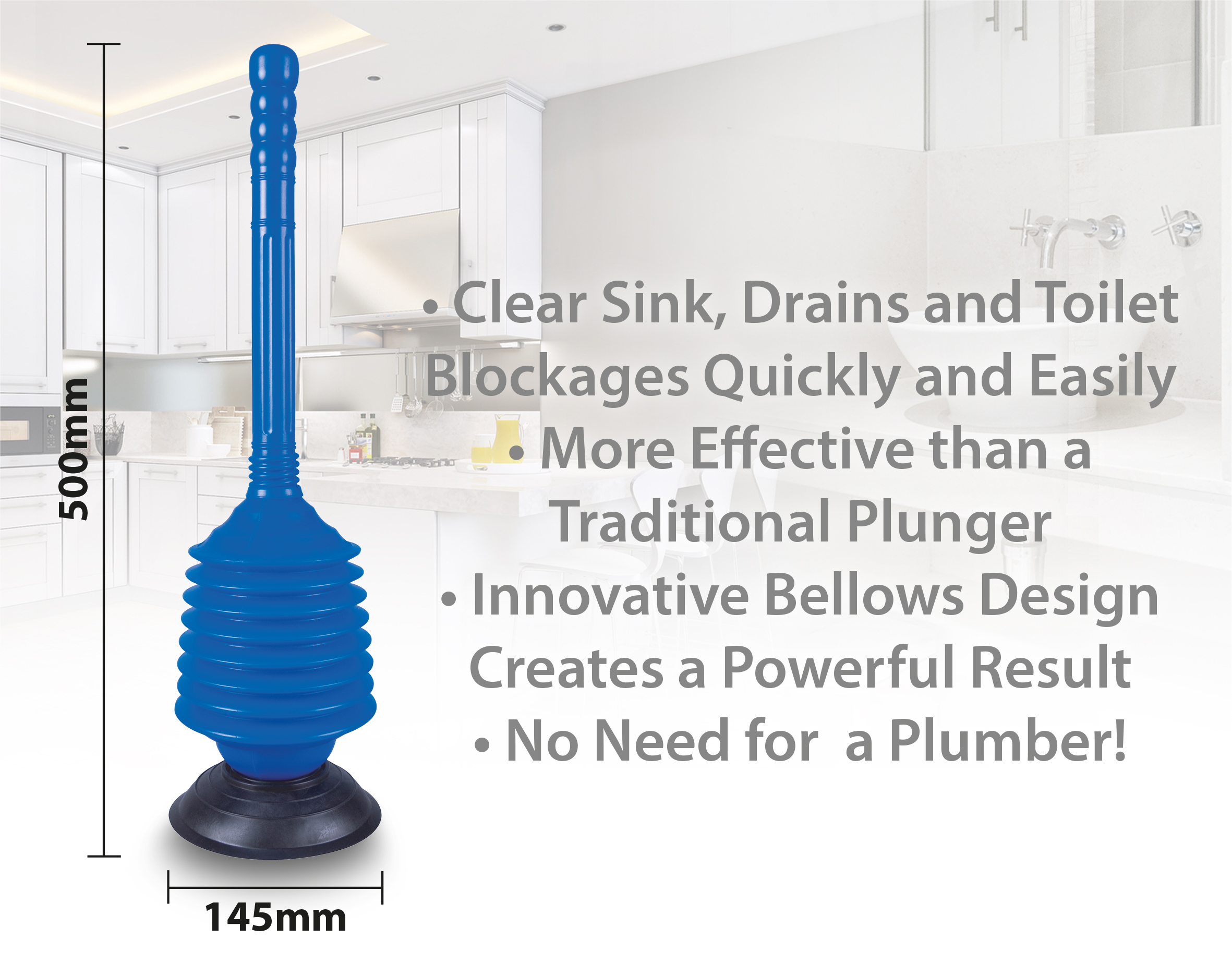 No need to suffer with slow draining and blocked showers, sinks and toilets, this bellows design plunger will fix it every time. Place the opening of the plunger over your clogged plug hole and with a few pumps the blockage will be cleared. The extra power comes from pressing down on the bellows, a much greater volume of air is forced down creating a more powerfull effect than a traditional plunger.