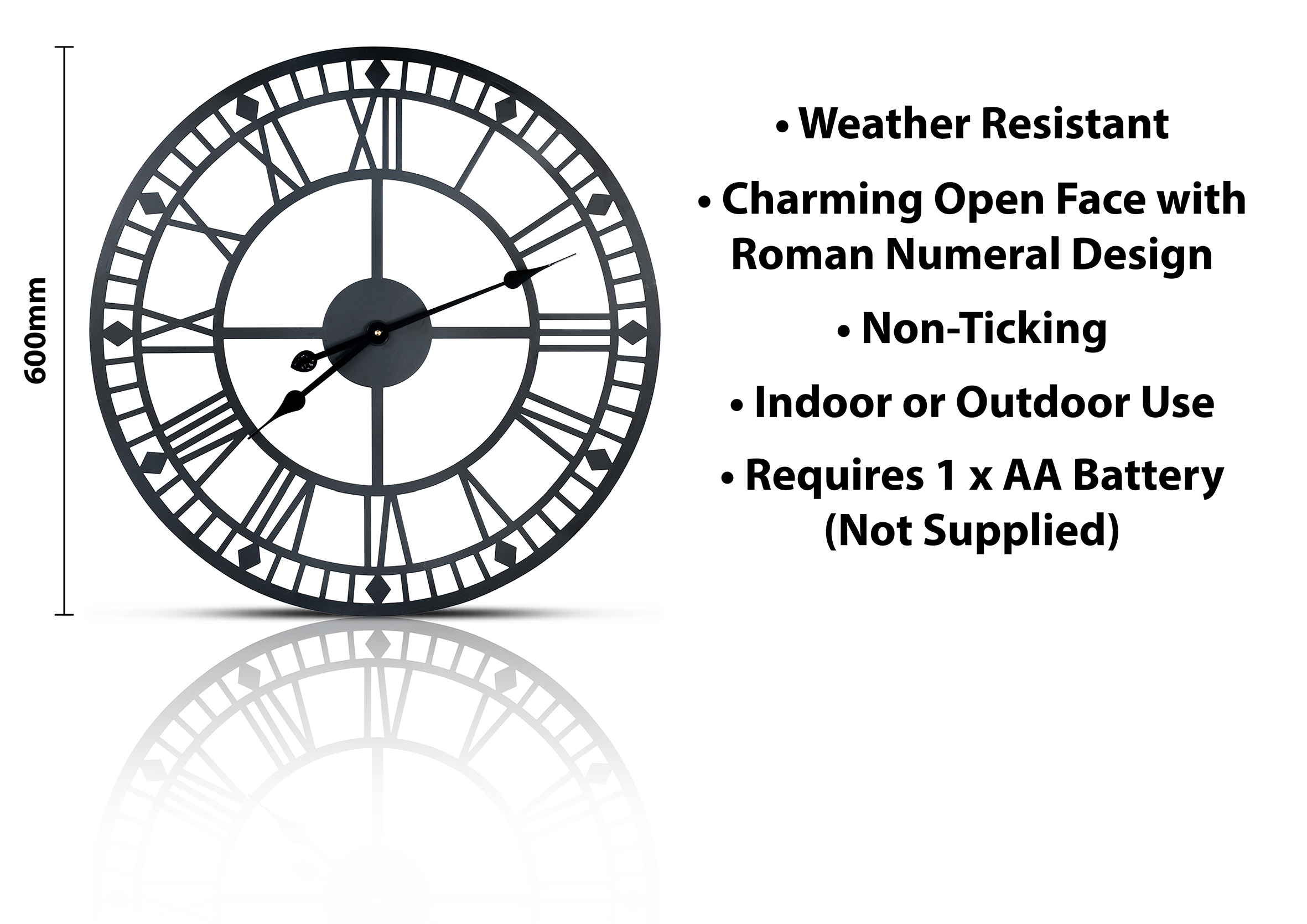This fabulous decorative outdoor or indoor wall clock from St Helens Home and Garden would make a welcome addition to any garden or home thanks to its charming open faced, roman numeral design. The clock is made from metal making it long lasting and suitable for the rigours of outdoor use. The clock is non ticking making it ideal for indoor use. Supplied with a fitted hanging bracket meaning it is extremely quick and easy to mount on outdoor walls, fences, summer houses, conservatories and sheds. Sit back, enjoy the beauty of your garden and literally watch time go by. The clock requires 1x AA battery (not supplied).