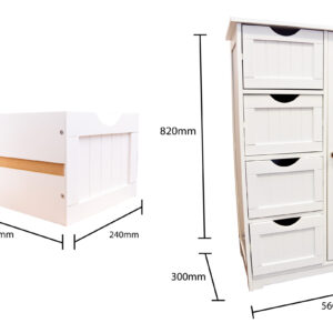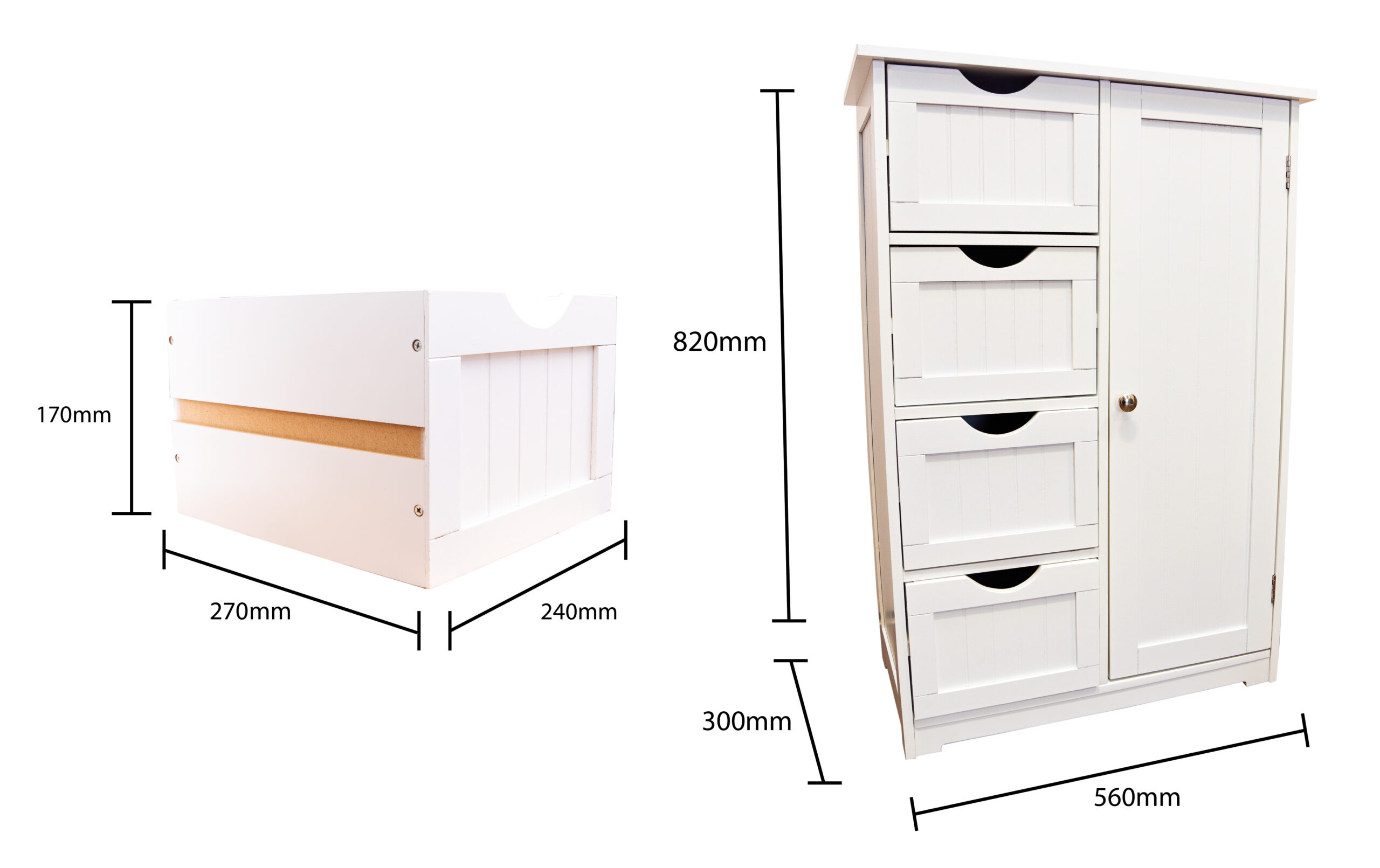 The freestanding bathroom cabinet from St Helens Home and Garden is the perfect mix of style and functionality and will enhance the look of any bathroom. The cabinet features 4 pull out drawers which give an abundance of storage space, each drawer has a generous depth of 25cm. The full-length door opens to reveal even more space including a shelf that would be ideal for storing towels, pyjamas, cleaning supplies or toiletries etc. The cabinet is white with a matching white handle to give a stylish and clean looking finish.