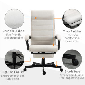 A home office chair, from Vinsetto – use this to get on with your work, wherever you are. A tall back, which is extra padded at the bottom for extra support, reclines back to a maximum 135?¨; paired with the manual footrest, gives a comfortable spot to rest and take time out. Other ergonomic features include the full-swivel seat, tall back and armrests. Complete with a wheeled base, this comfy chair moves around easily.