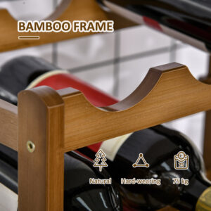 Save space and stay organized with this bamboo wine storage rack from HOMCOM. 4-Tier compact design allows it to save a lot of space and can hold up to 16 wine bottles. Made of hard-wearing bamboo, the freestanding bar shelves provide a natural and warm look and is suitable for everyday use. This display shelf is a must-have for those looking to start their first wine collection or for more experienced collectors.