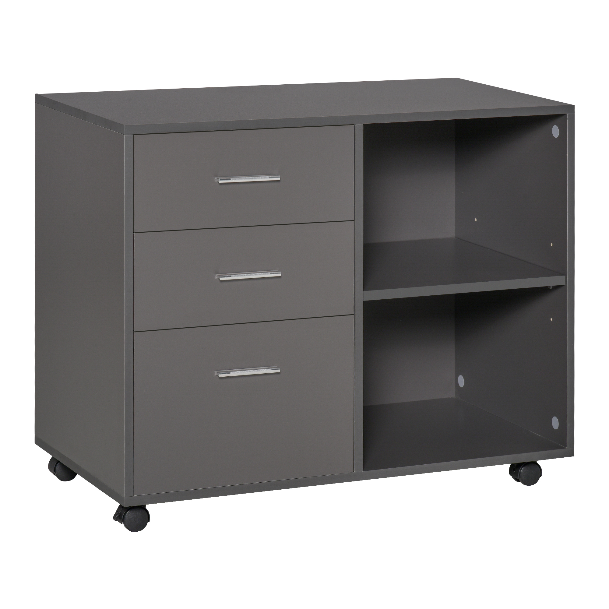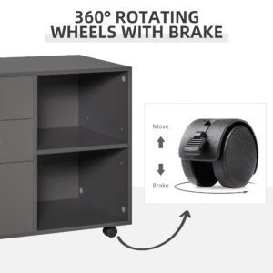 Give your office style and storage all at once with this cabinet from HOMCOM. It features two open compartments and three drawers, giving you plenty of space to keep files, folders and stationary organized. The shelf on the right can be adjusted to suit your needs. Four castor wheels ensure easy movement, with two lockable to keep stationary. It’s made from particle board, ensuring it is tough and durable for everyday use, in a black colour for a sleek addition which sits well-placed anywhere.