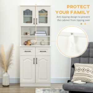 Kitchen running out of space? Then this HOMCOM storage cabinet will get clutter organised in no time. Say hello to its multi-storage design: features a top cupboard with glass doors, two middle shelves, two drawers and a bottom cupboard; the two upper shelves can be moved up/down, or even removed, for storage space more suitable for you. Made from a particle board and MDF blend, this kitchen cupboard is sturdy, complete with anti-tipping straps for safety.