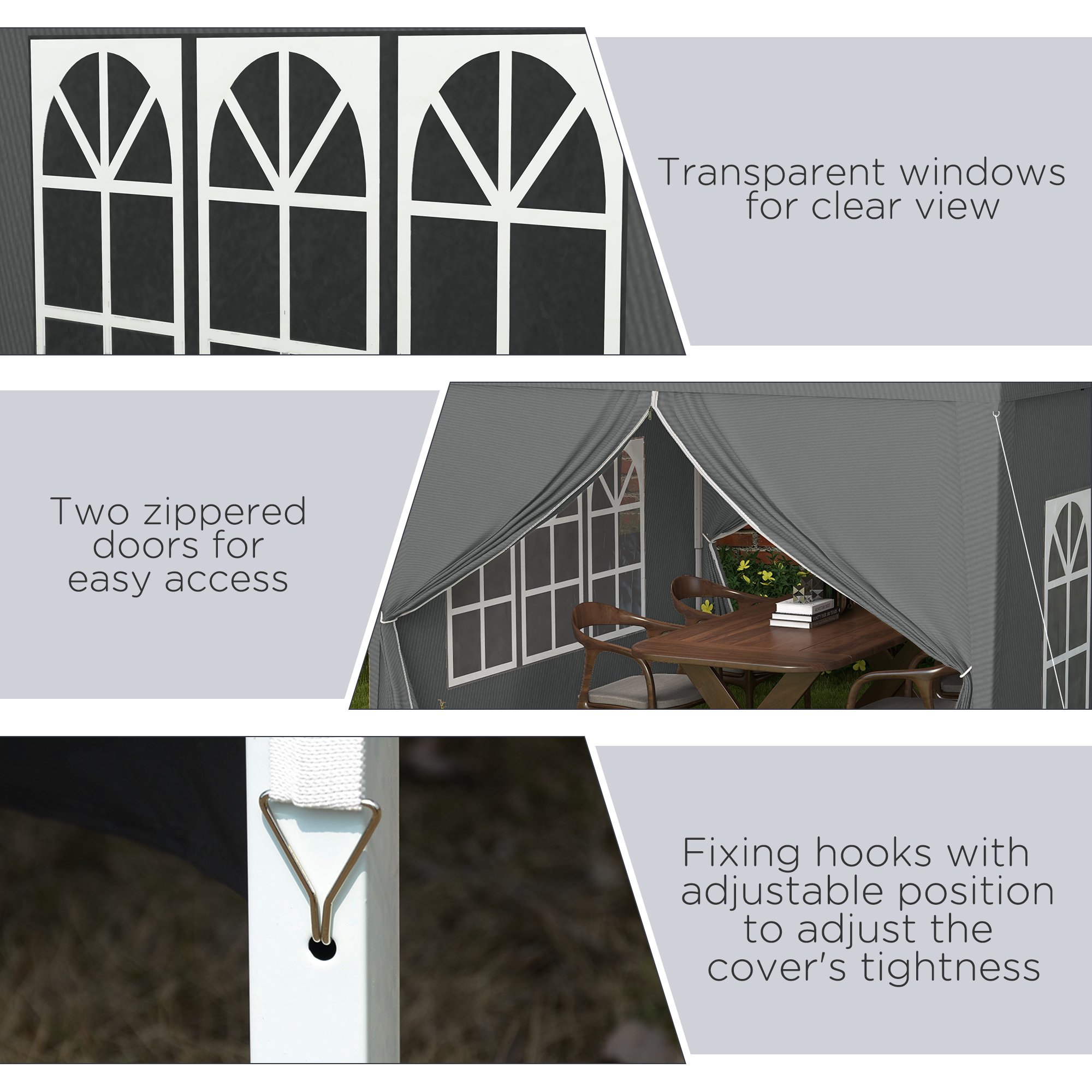 - Four removable side walls: create an open or enclosed atmosphere