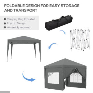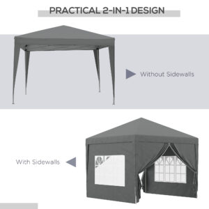This Outsunny 2.95 x 2.95m gazebo with sides is a great, no-fuss outdoor shelter. It is Ideal for family parties, weddings, picnics, sports events, outdoor vendors, craft fairs, job sites and camping trips. The pop-up design makes set-up and take down super easy. It features two removable walls: create an open or closed feel, whenever. The powder-coated steel frame means a strong standing structure. Comes with guy ropes and ground stakes to pin to the ground for extra stability.