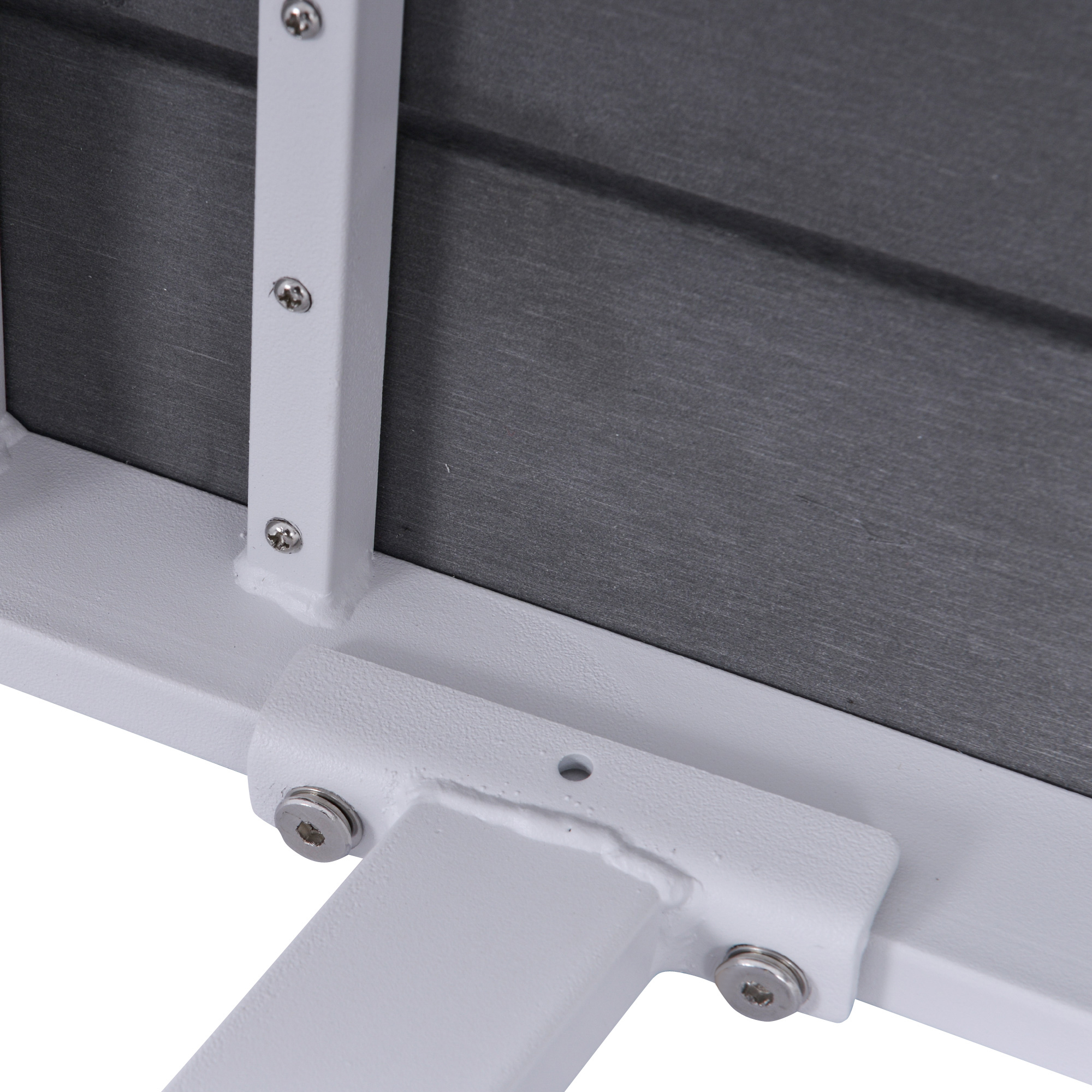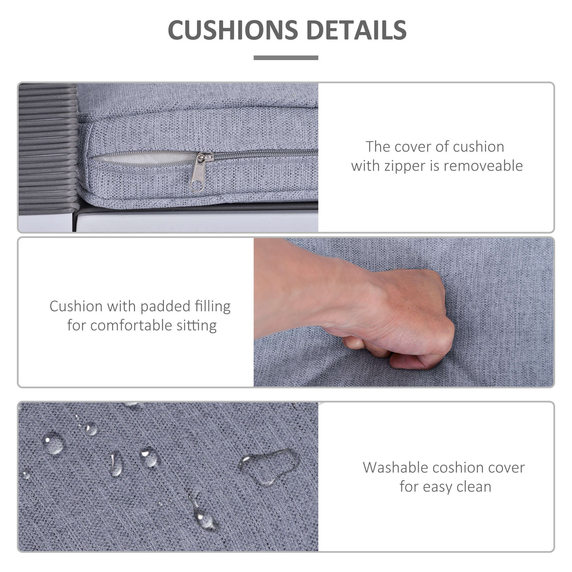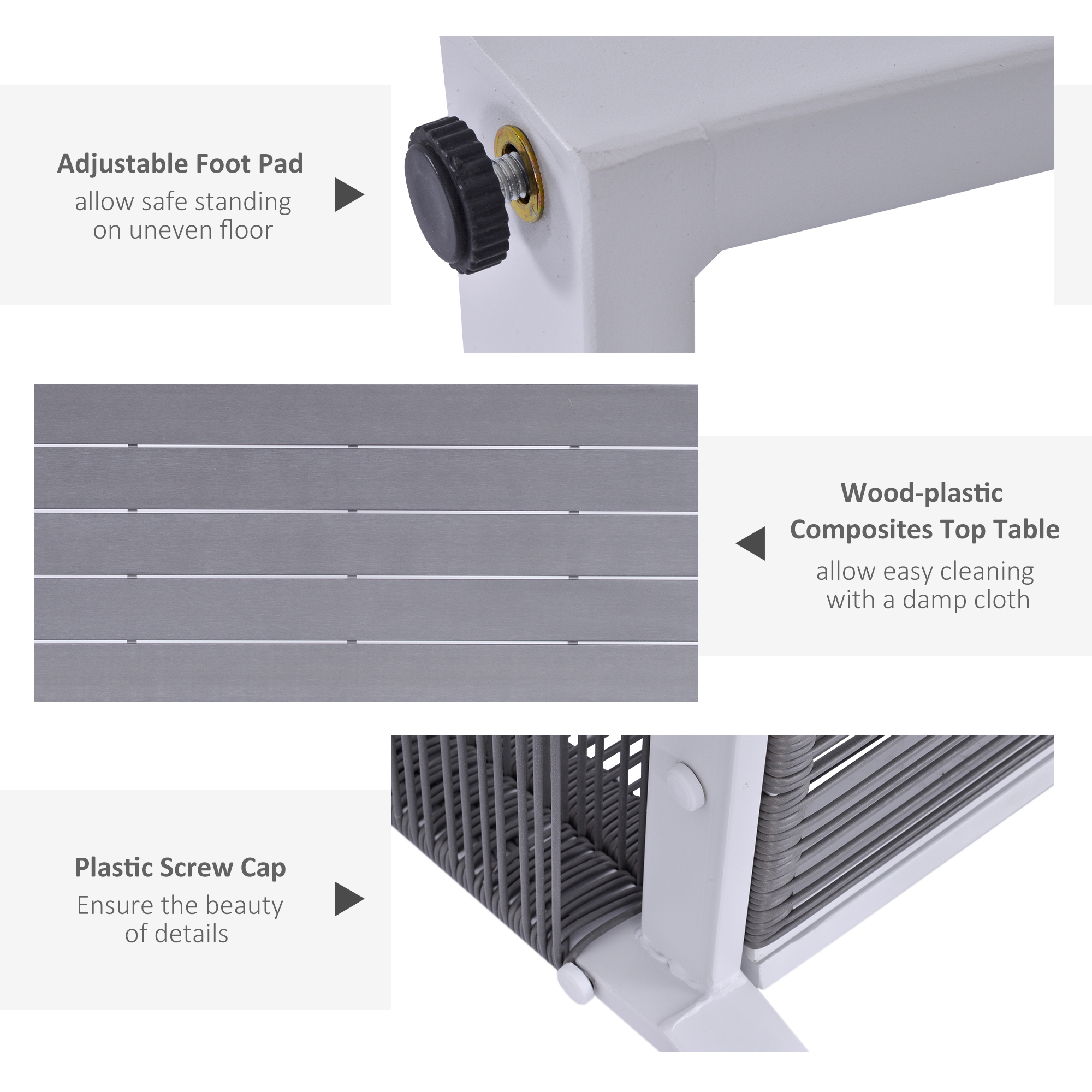 Straight lines and minimal style define this outdoor dining set from Outsunny. The seats of the corner rattan dining set are a combination of the exposed white steel frames and grey threaded PE wicker on the back and sides for a cool and unique look. The frames of the rattan corner sofa dining set are powder coated for extra strength and a boxy shape so they keep balanced. Finished with a padded cushion on each seat of the garden soda dining set for comfort and adjustable foot pads for balance.