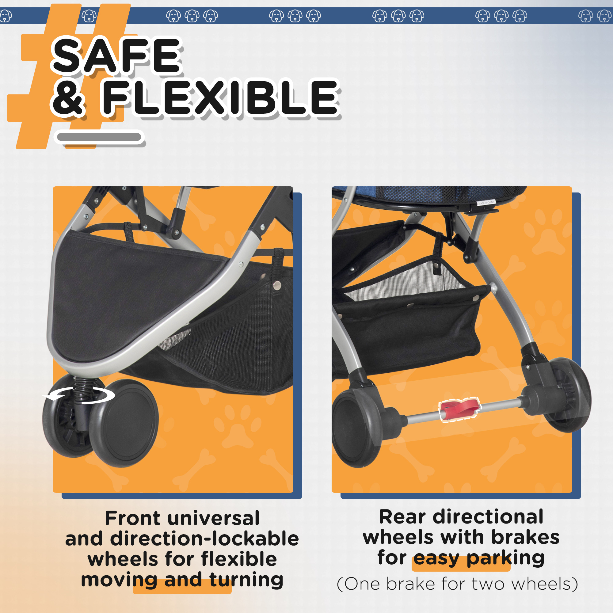 - 1 front universal wheel and 2 rear directional wheels with a brake for complete control and a smooth ride