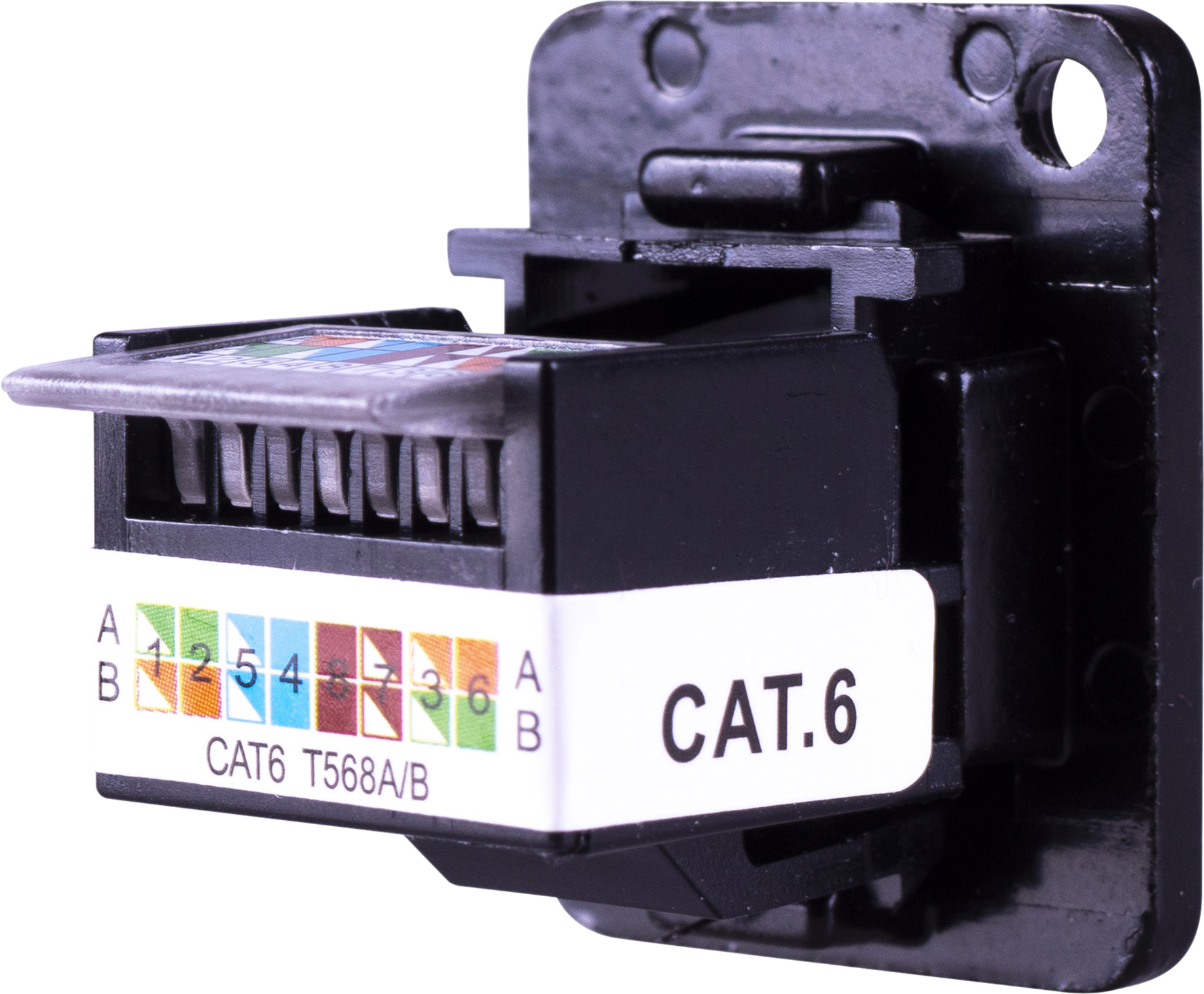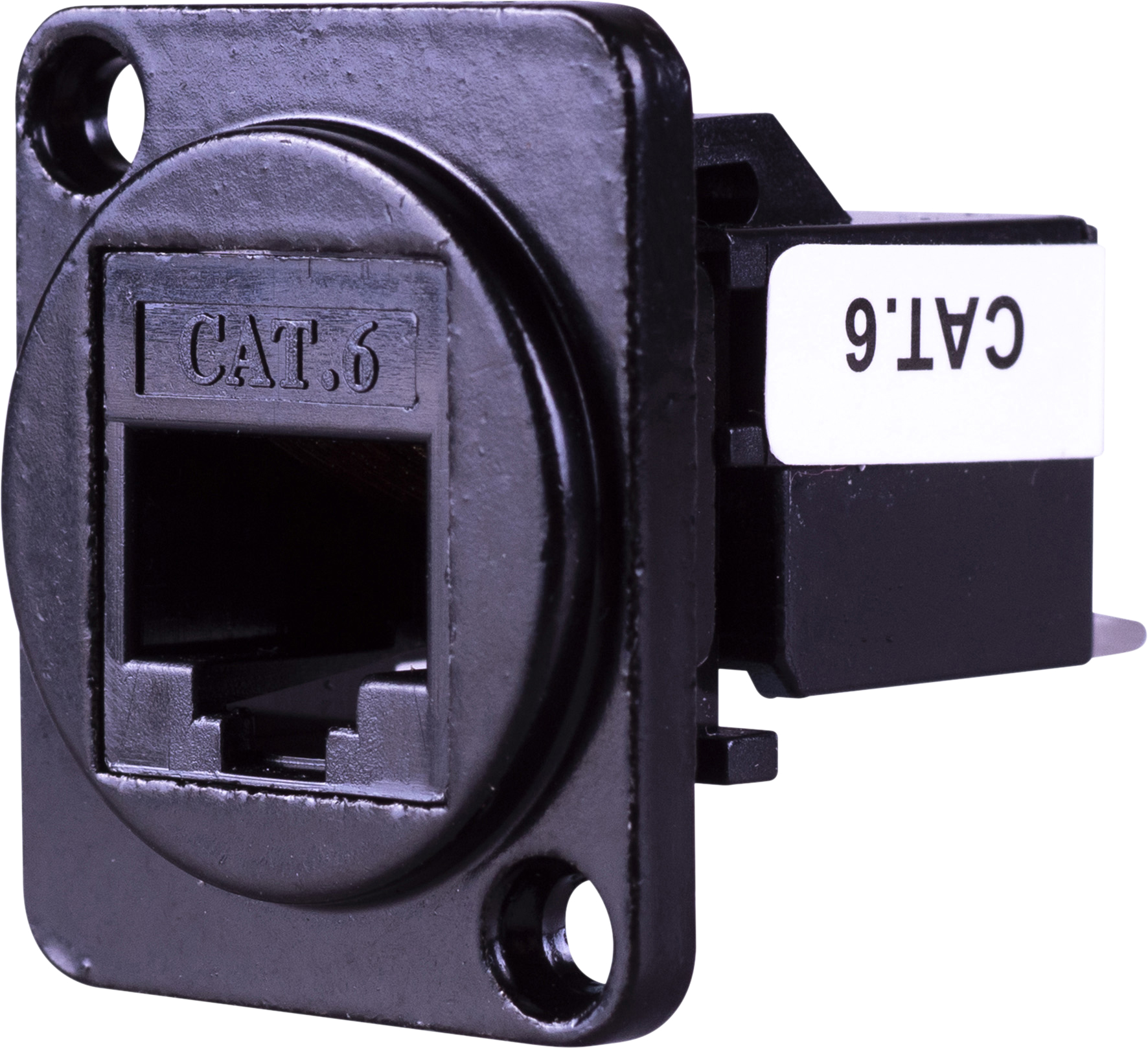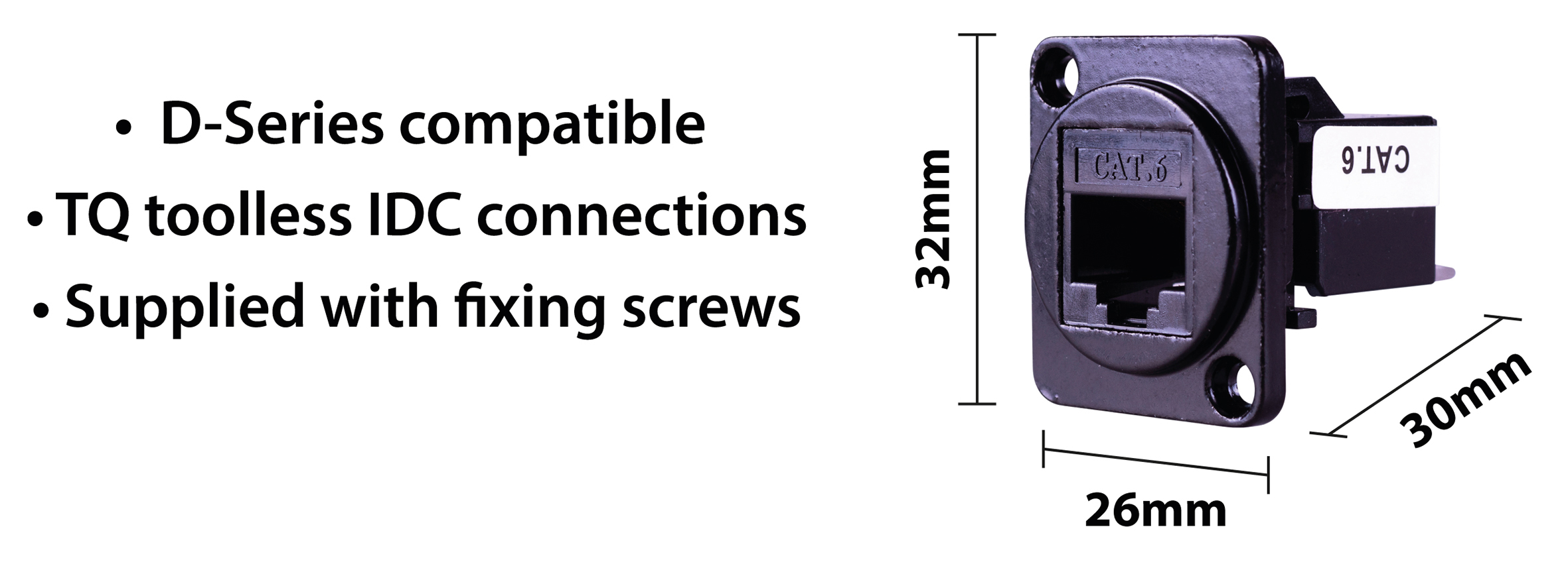 Chassis Mount D-Series compatible Cat 6 socket TQ toolless IDC connections. Supplied with fixing screws.