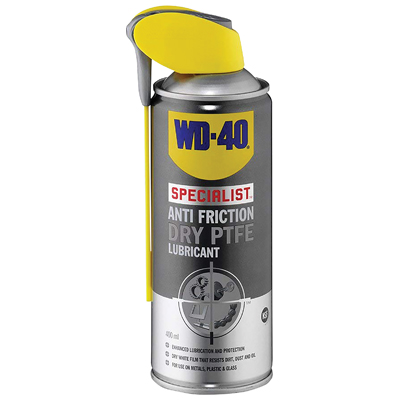 WD-40® Specialist® Anti-Friction Dry PTFE Lubricant||Lubricates with PTFE (Polytetrafluoroethylene)||Quick dries to a clear film||Won’t attract dust, oil or dirt||Protects against wear and tear||Works as a mould release agent