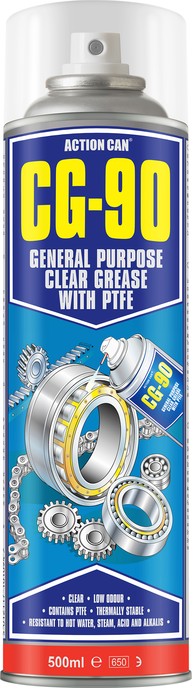 CG-90 is a clear, general-purpose grease for superior lubrication. It demonstrates excellent surface adhesion with a high tack strength whilst penetrating parts quickly and then thickening to form a long-lasting NLGI 2 grease. CG-90 contains PTFE which greatly enhances lubrication performance and reduces friction. CG-90 has excellent thermal stability and is resistant to hot water, steam, acids and alkalis preventing corrosion. Wide operating temperature range from -12°C to +180°C and will not break down under high loads. Use for the lubrication of a wide variety of bearings, hinges, small gears and sliding metal parts.