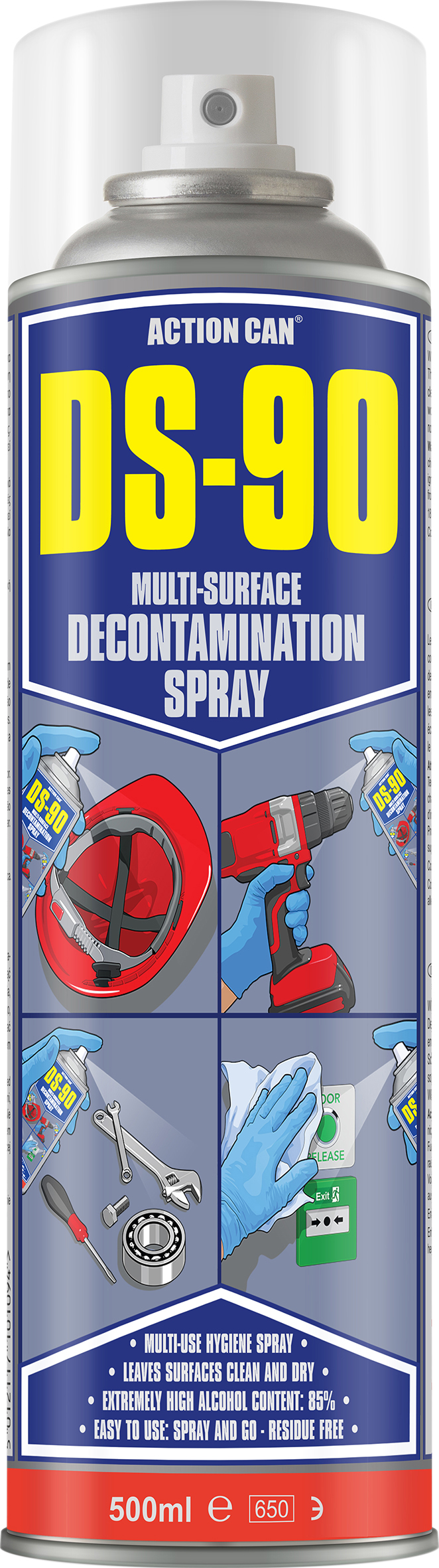 DS-90 is a versatile, high alcohol content spray for decontaminating all hard surfaces. Ideal for use on high touch-point surfaces such as work benches, tool cases, tools and as a general workplace cleaner, quickly removing dirt, grime and oils. Removes contamination from most surfaces, including: metal, fabrics most plastics. Warehousing production: Forklift trucks, pallet truck, tape guns, hand held scanners, door handles, taps work benches Trade Counters: Cash registers, card machines, merchandise, tools material handling equipment Service Engineers (sites home visits): Vans, door handles, steering wheels, tools, boiler casings, H-Vac units workwear • Offices: Desks, chairs, phones alarm unit
