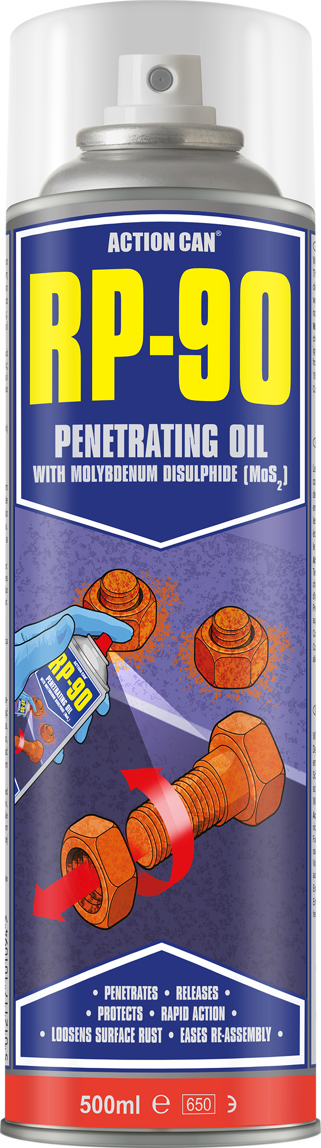 RP-90 is a professional grade penetrating oil, with MoS2 (moly). Fast-acting, it quickly releases the toughest seized and most corroded threaded fasteners and fixings. Excellent penetration into hard to reach areas, seeping through rust and corrosion for effective results. Frees nuts, bolts, screws studs, pins, valves, machine parts, pipe couplings and pulleys. For cleaning rusted surfaces of moulds, dies, heavy tools and carbon deposits.