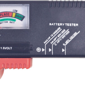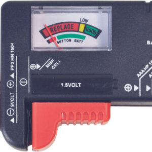 A universal battery tester capable of testing most of the popular dry cell types under actual load conditions. Easy to read meter indicates battery condition at a glance. Tests PP3 (9V), AAA, AA, C, D, 4SR44 (6V), 1.5V button cells. Simple operation and sliding movement to fit various battery sizes. Supplied in a blister card